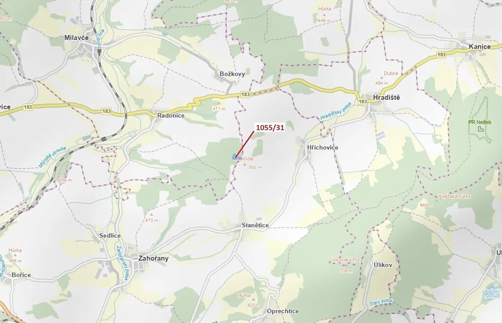 Lesní pozemek o výměře 9 168 m2, parcelní číslo 1055/31, podíl 1/1, katastrální území Radonice u Milavčí, obec Milavče, obec s rozšířenou působností Domažlice, okres Domažlice, Plzeňský kraj.