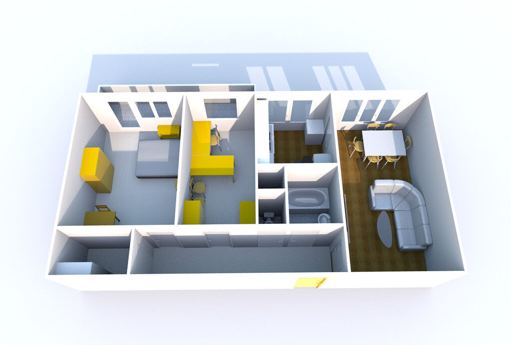 Dominantou bytu je obývací pokoj navazující na malou kuchyň. V rámci rekonstrukce byla kuchyň vybavena novou kuchyňskou linkou. Kuchyňská linka je vybavena zabudovanými spotřebiči. Koupelna je vybavena vanou. WC je samostatné. V chodbě se nachází prostorné šatní skříně a vstupy do dalších samostatných pokojů – ložnice a dětského pokoje a komory. Na všech plastových oknech jsou žaluzie. Veškerá okna bytu jsou orientována na jihozápadní stranu do zeleně, což zajišťuje dostatek klidu a soukromí.