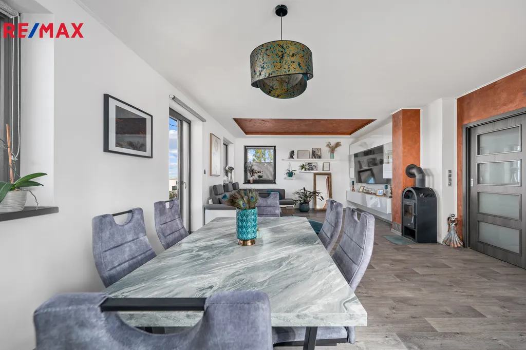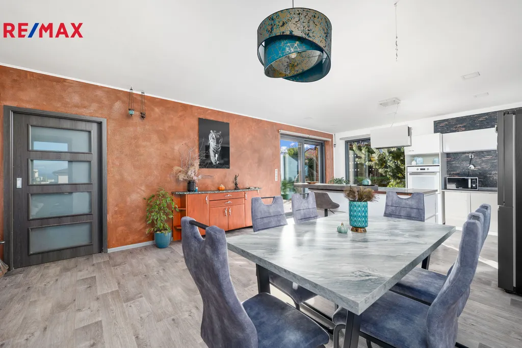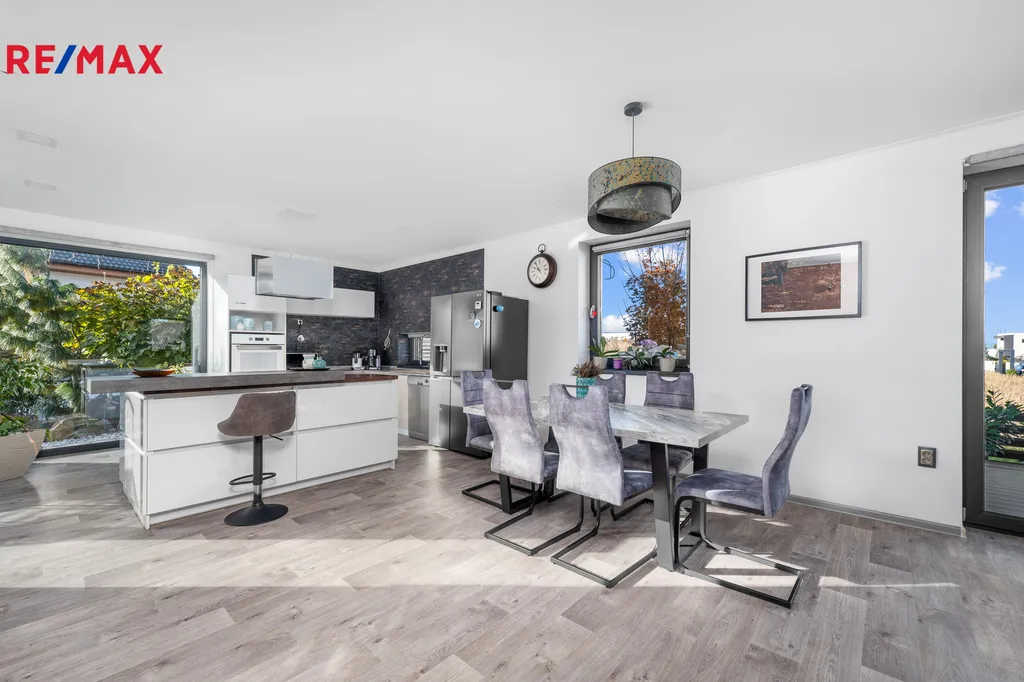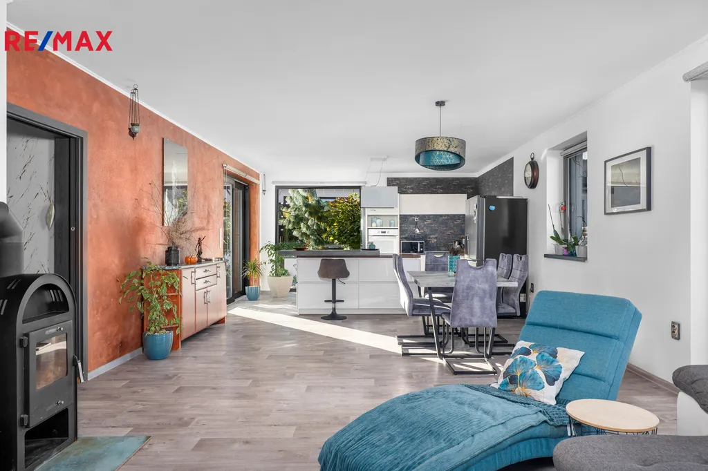 Dům nabízí 4 pokoje, které nabízí pohodlný život pro rodinu a jsou se samostatnými vstupy. Obývací pokoj, který je propojený s kuchyní s ostrůvkem a dále se zde nachází krbová kamna, která jsou ideální k posezení s celou rodinou a k relaxaci. Dům je velice prakticky navržen, vstupuje se chodbou, kde je na míru dělaná šatna, po pravé straně se nachází zádveří, dále navazuje na technickou místnost. Prostorná koupelna se sprchovým koutem, dvoj umyvadlem a vanou a WC, samosatný WC. Po pravé straně se nachází samostatná ložnice, dále 2 dětské pokoje a chodbou se navazuje vstupem do obytné místnosti s kuchyní. Velmi krásně řešený, kde rodina najde zázemí a pohodlí. Kuchyňská linka Vám nabízí plnohodnotný osvícený ostrůvek s barem, kde se nachází indukční varná deska, dále je kuchyň řešená do L.