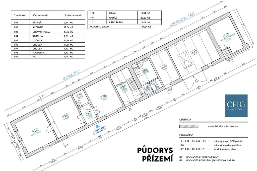 Současné obytné přízemí o užitné ploše cca 80 m2 je v současném stavu tvořeno dispozicí 2+1. Dále na něj navazuje dílna 10 m2, garáž s montážní jámou a cca 25 m2 a podsklepený přístřešek cca 12 m2. V podkroví se nachází ještě jeden obytný pokoj cca 27 m2. Zbylý prostor půdy nabízí dalších cca 134 m2 plochy a díky výšce ostění je vhodný jako další potenciální obytný prostor.