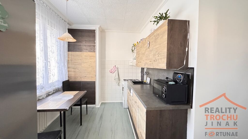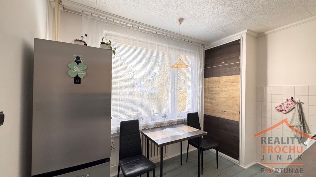 Dispozice: 1 obytná místnost se vstupem na lodžii (3,5 m2), kuchyňský kout s jídelnou, koupelna (vana), samostatné WC, chodba (vestavěné skříně), sklepní kóje. Topení: ÚT – dálkové.