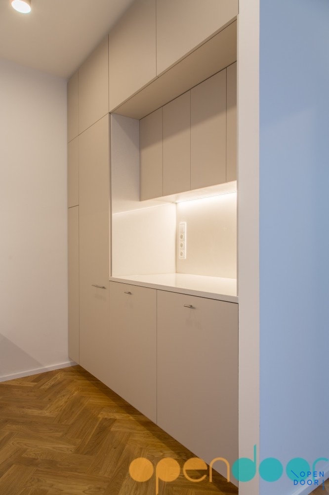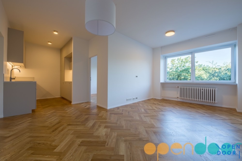 Byt je po nedávné kompletní nákladné rekonstrukcí ve spolupráci s Ing. arch. Markétou Bromovou, která zásadně vylepšila jeho charakter a dispozici. Při přestavbě byly využity nadstandardní kvalitní materiály, všechny nábytkové prvky byly vyrobeny na míru. Z původního 2+1 vznikl příjemný obývací prostor s novou parketovou podlahou, volně navazující na kuchyňský kout, vybavený moderní linkou se všemi vestavěnými spotřebiči, ložnicí s vestavěným šatními skříněmi a blackout roletami, luxusní koupelnou vybavenou pračkou a sušičkou. V předsíni vznikl nově velký samostatný úložný prostor, který lze využít jako šatnu, lze i parkovat jízdní kola. Okna bytu směřují do parku směrem k Vltavě. V domě je zaveden internet Vodafone.