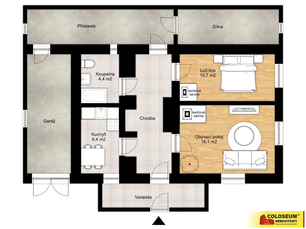 Vstup domu obklopuje praktická veranda, na které si vychutnáte sklenku dobrého vína, při teplém letním večeru. Následuje prostorná chodba, kterou se dostaneme do obývací místnosti, jejíž dominantou jsou kachlová kamna, sloužící jako centrální vytápění celé chalupy.