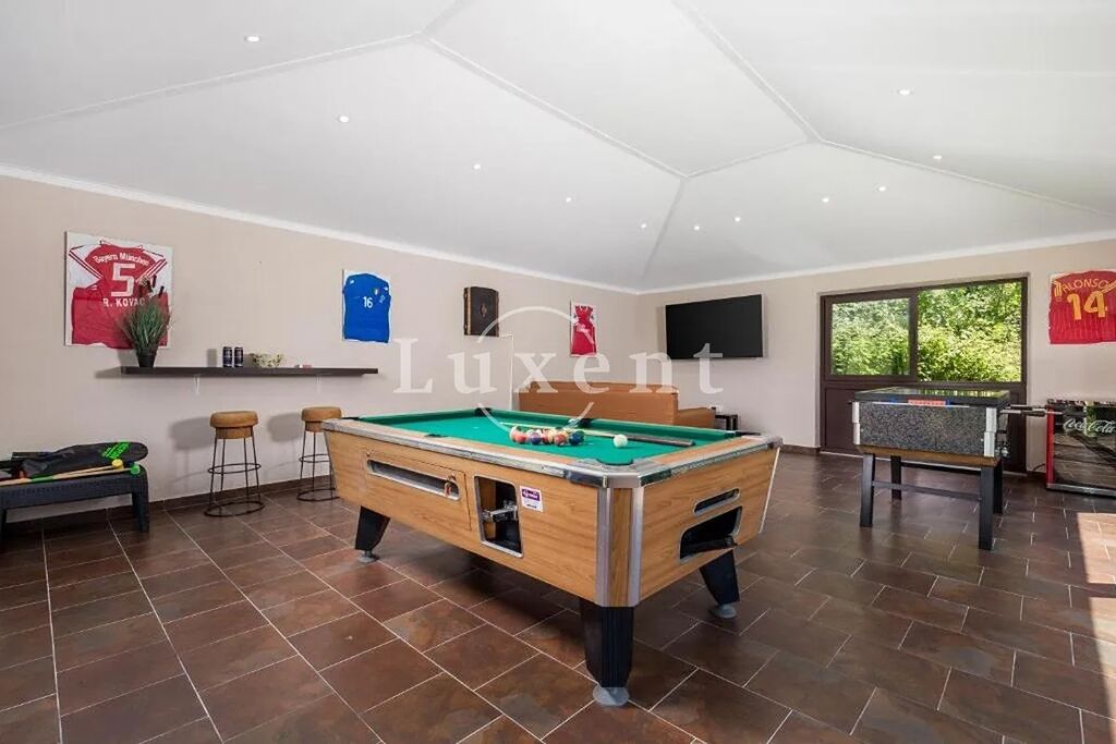 Venkovní prostory zahrnují bazén, terasu na opalování a pohodlný lounge koutek, který tvoří ideální místo pro relaxaci během letních dní. Další přidanou hodnotou je samostatná budova o velikosti 50 m² určená k zábavě, vybavená stolním tenisem, PlayStationem, šipkami a stolním fotbalem. Nemovitost nabízí také dostatek soukromého parkování a perfektní rovnováhu mezi rustikálním půvabem a moderními prvky, což činí tuto nemovitost ideální jak pro trvalé bydlení, tak jako výnosnou investici na pronájem.