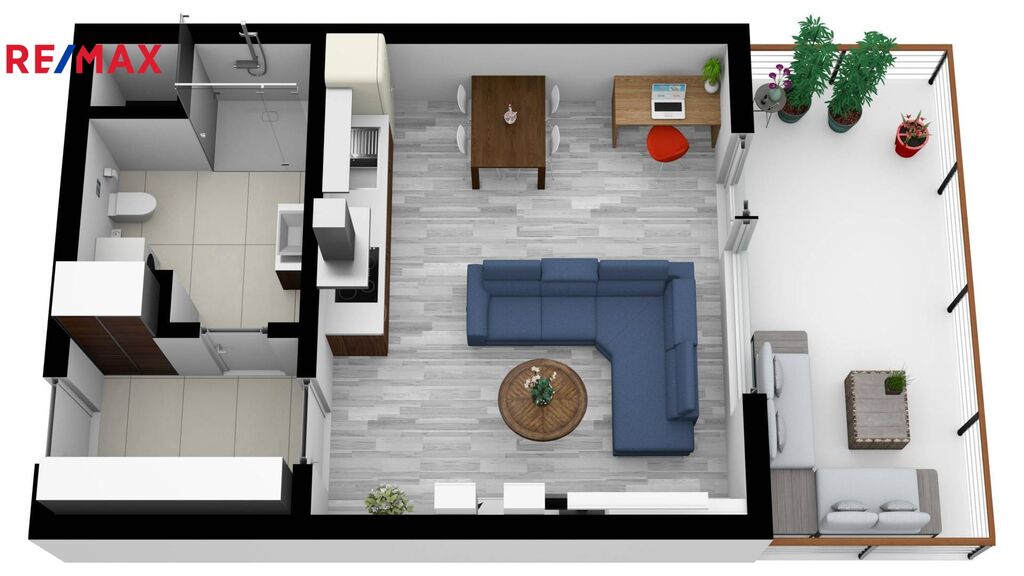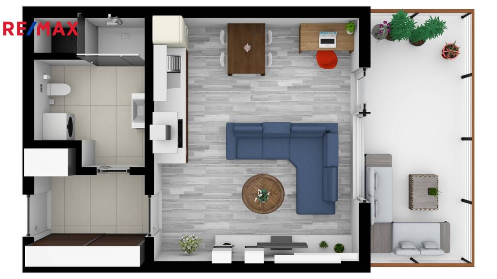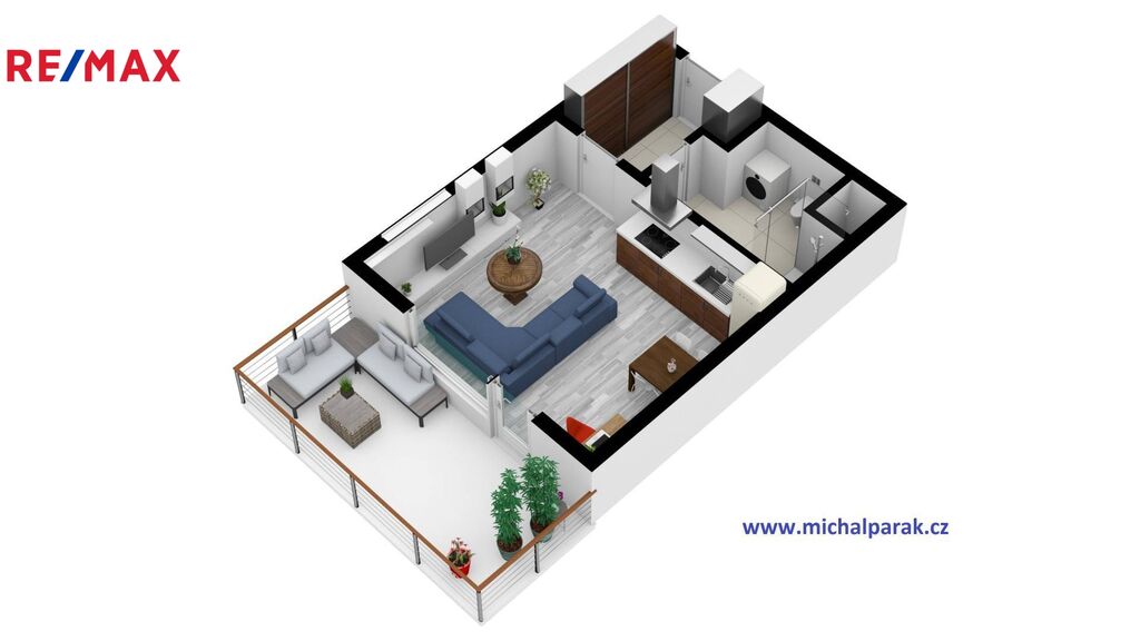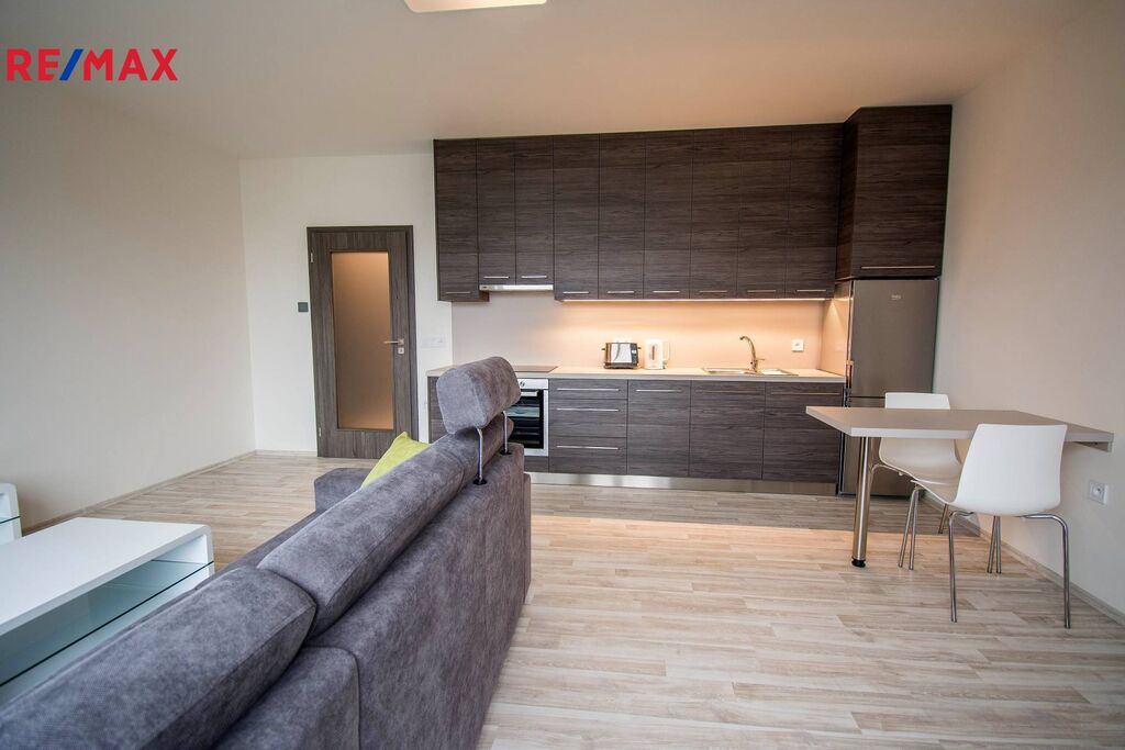 Byt tvoří vstupní chodba s velkou vestavěnou šatní skříní, koupelna se sprchovým koutem a WC a světlý obývací pokoj s kuchyňskou linkou. Z pokoje je přímým vstupem na terasu. Kuchyň je plně vybavená spotřebiči – sklokeramická varná deska, el. trouba, lednice s mrazákem, digestoř a kompletní nádobí.
