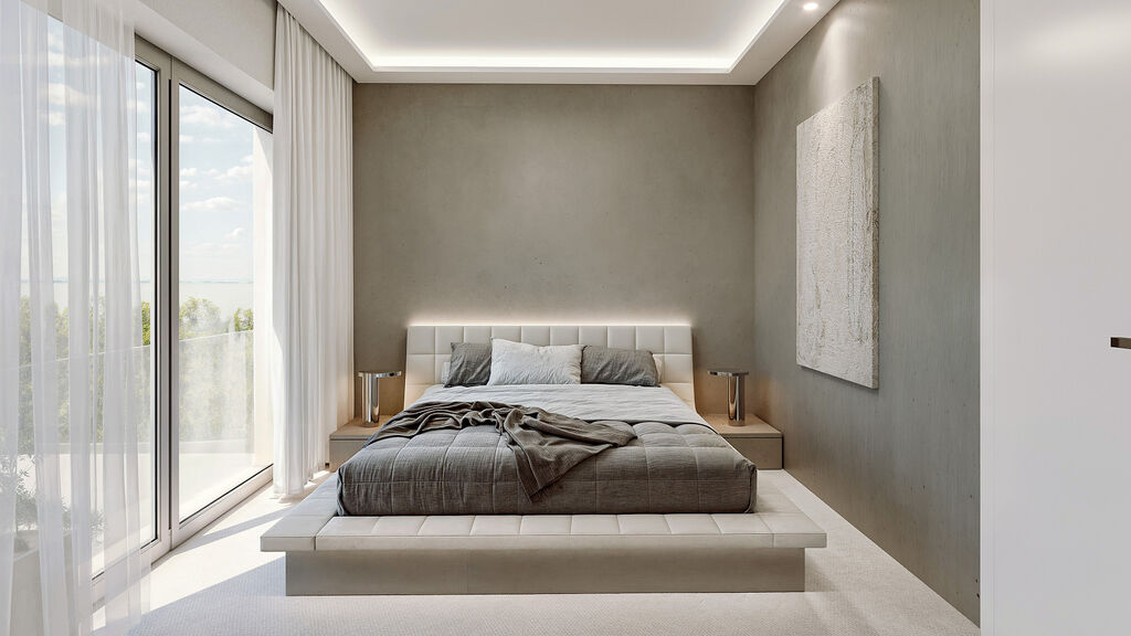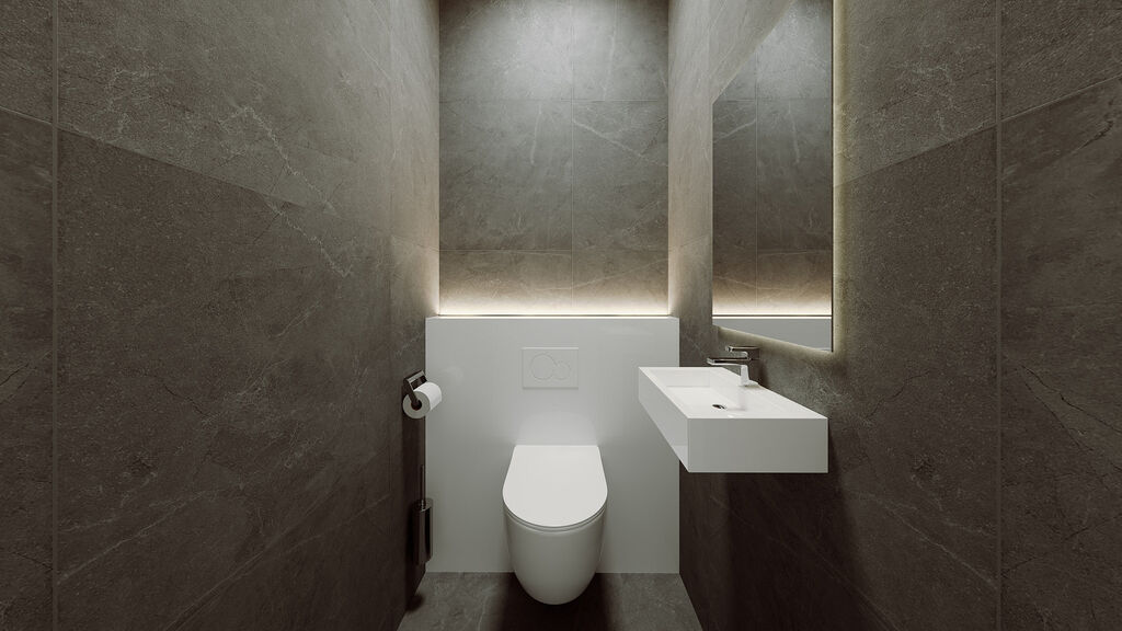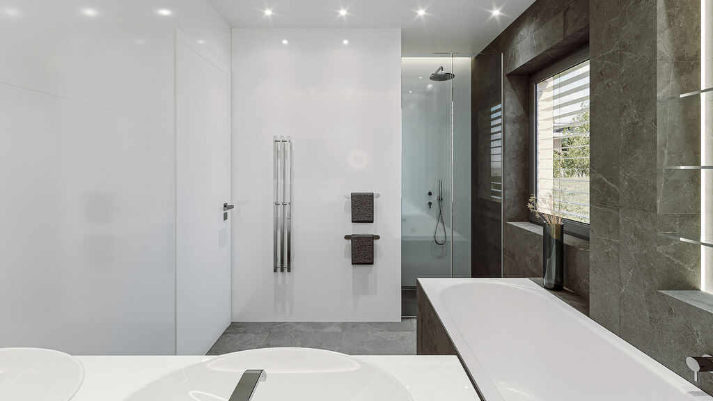 •	Luxusně zařízená koupelna dle vizualizací (vana, sprchový kout, podomítkové baterie, dvojité umyvadlo, osvětlené zrcadlo, topný žebřík, nika)