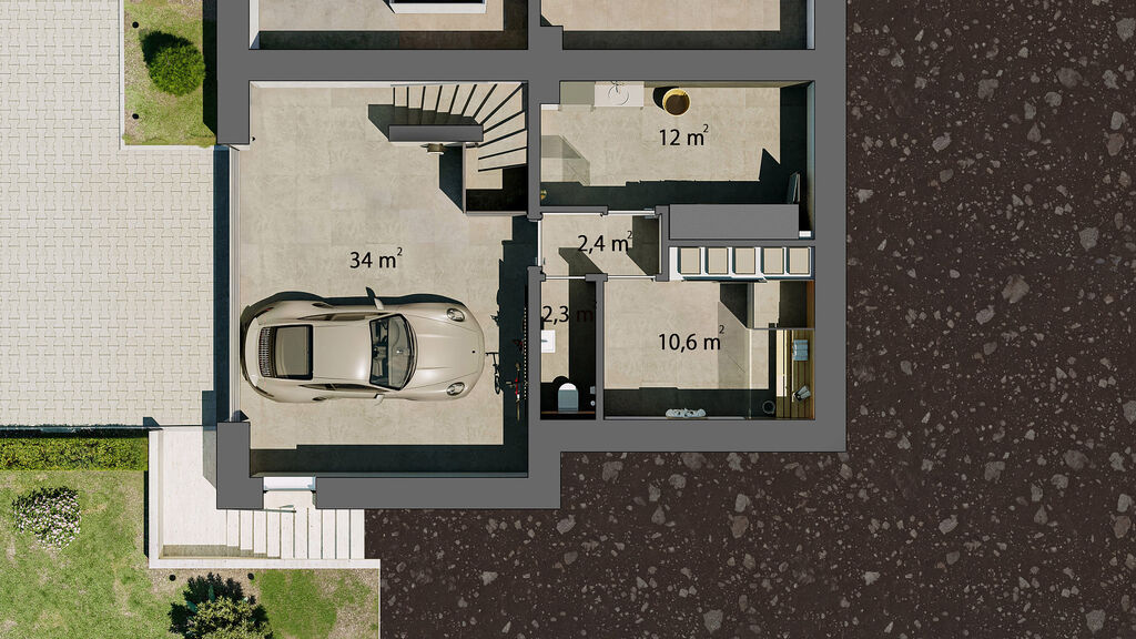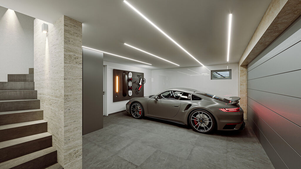 •	Velkorysá garáž pro 2 vozy (34 m²) obložená italským travertinem