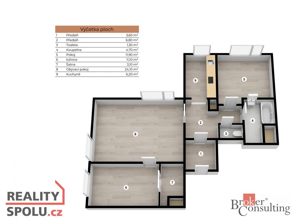 Užitná plocha bytu je 75,57 m² vč. 2,2 m² velké sklepní kóje. Možné je využívat i společnou kolárnu/kočárkárnu.