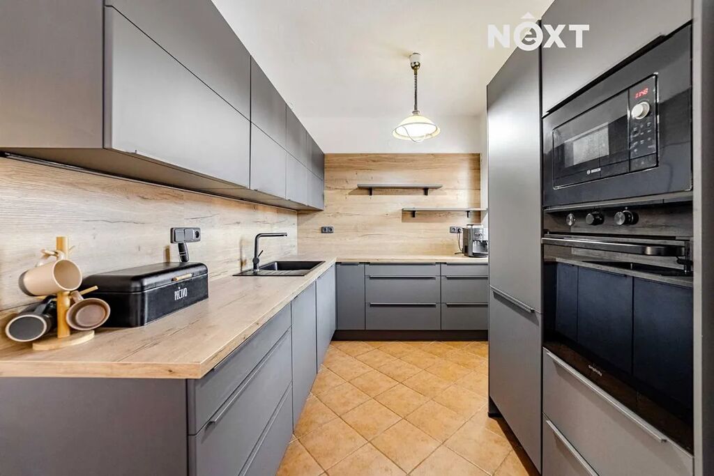 Horní bytová jednotka je stylová a moderní. Najdete tu kuchyň s ostrůvkem a velkou jídelnu (cca 30 m²), kde se pohodlně sejde celá rodina. Dále obývací pokoj, dvě ložnice, koupelnu, komoru a chodbu.