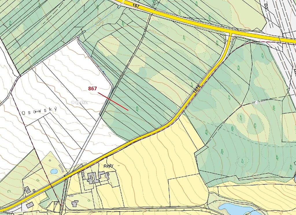 Lesní pozemek o výměře 3 608 m2, parcelní číslo 867, podíl 1/1, katastrální území Netřebice, obec Netřebice, obec s rozšířenou působností Kaplice, okres Český Krumlov, Jihočeský kraj. Částečně po těžbě.