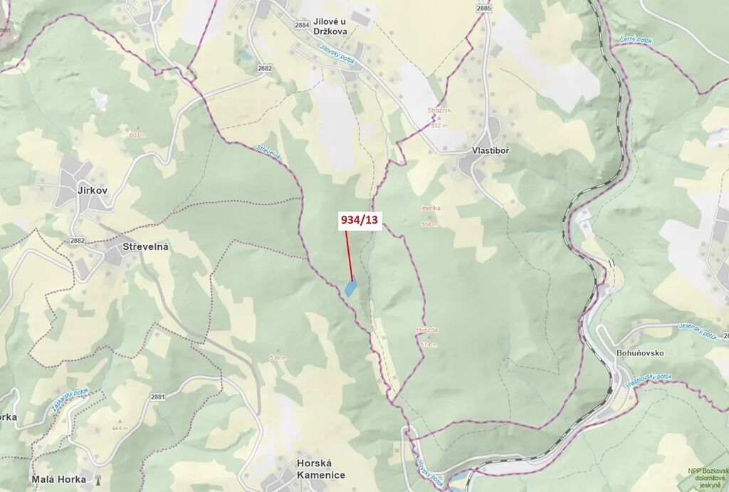 Lesní pozemek o výměře 6 213 m2, parcelní číslo 934/13, podíl 1/1, katastrální území Jílové u Držkova, obec Jílové u Držkova, obec s rozšířenou působností Železný Brod, okres Jablonec nad Nisou, Liberecký kraj.
