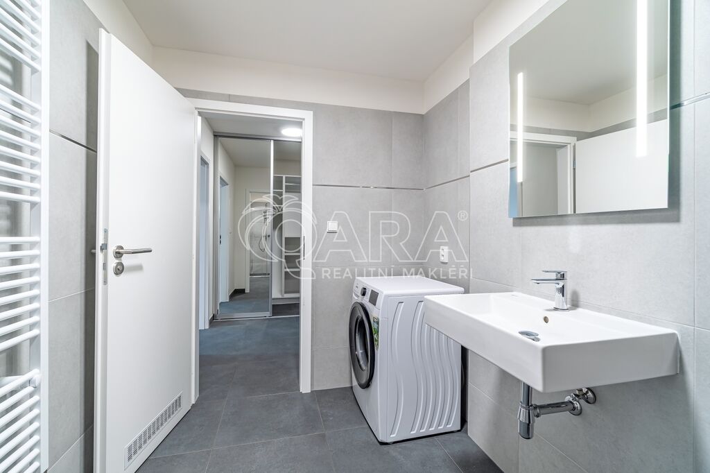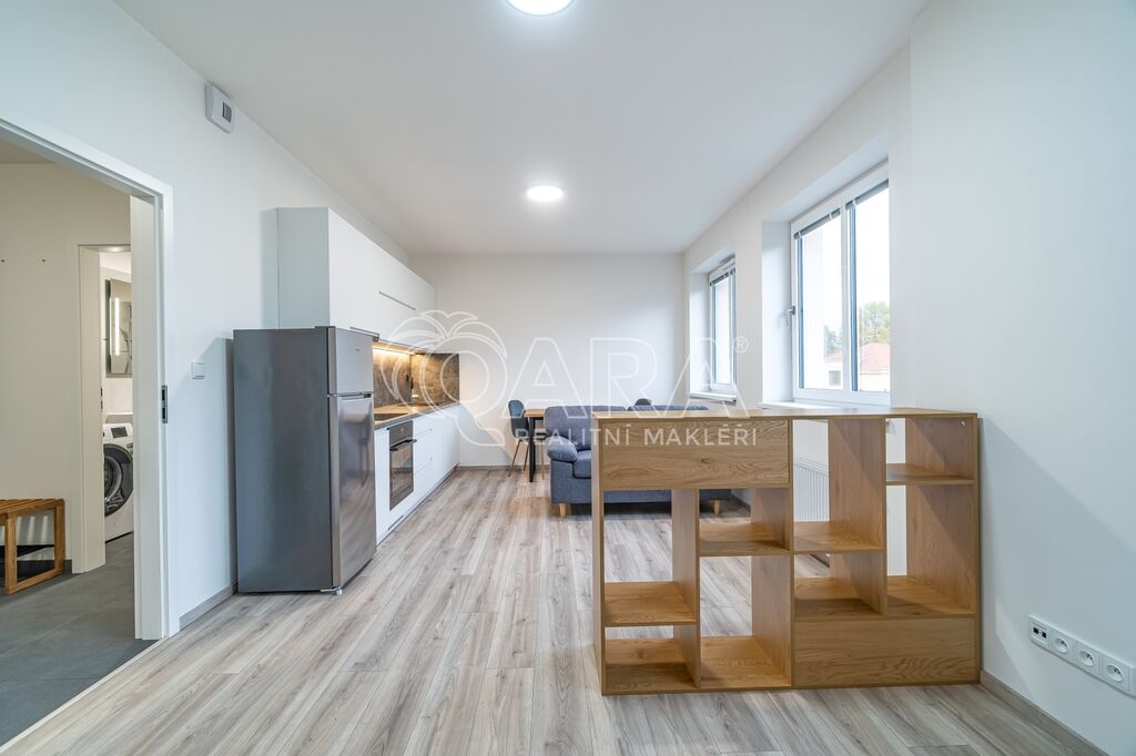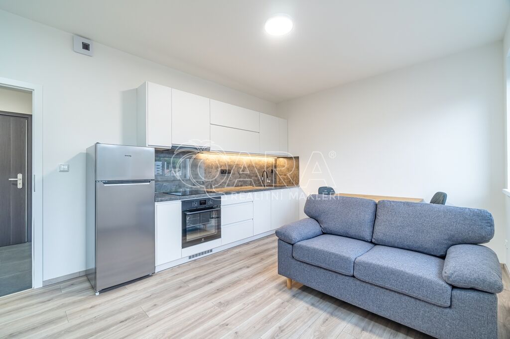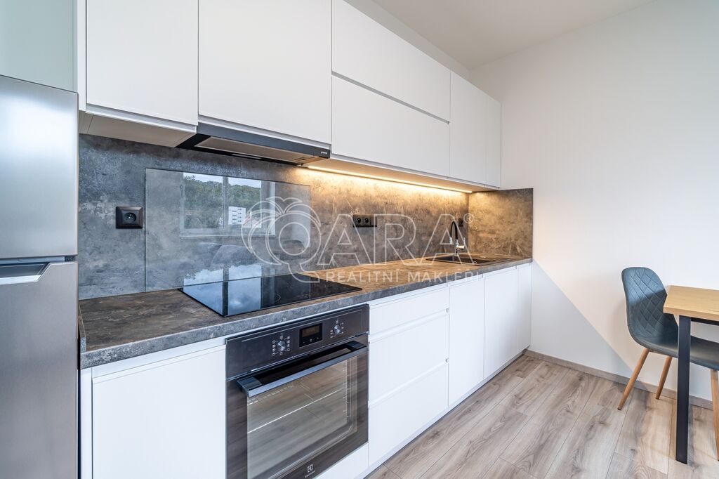 V bytě je k dispozici moderní kuchyňská linka vybavená indukční varnou deskou, digestoří, pečící troubou a myčkou nádobí, dále pak také chladničkou s mrazákem.