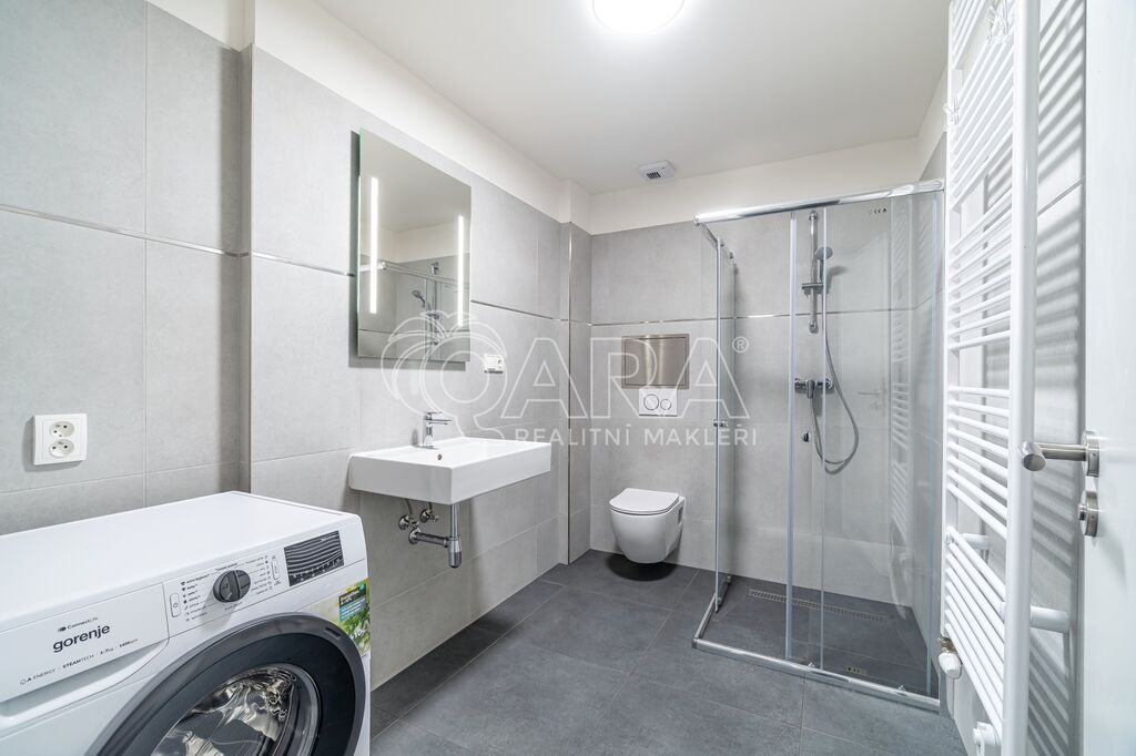 Skládá se z předsíně (4 m2), praktické a prostorné šatny se zrcadlem (2,5 m2), koupelny se sprchovým koutem a toaletou (5,3 m2), a z obývacího pokoje s kuchyňským koutem (21 m2).