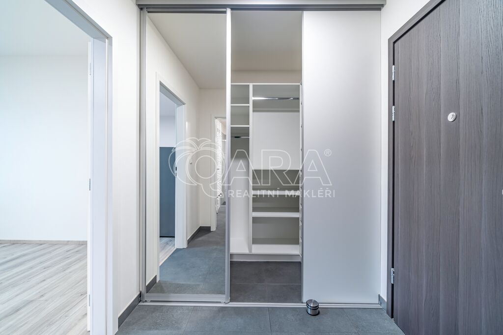 Šatna v předsíni pojme oblečení jako 3 skříně, takže o úložný prostor v bytě není nouze.