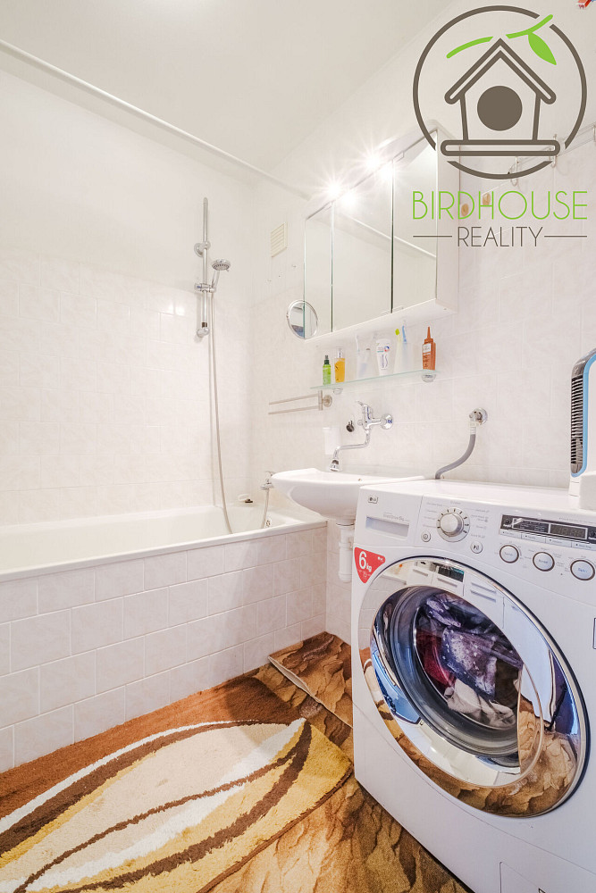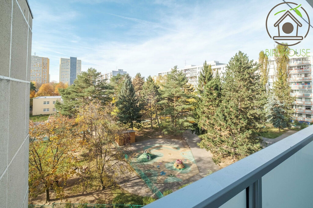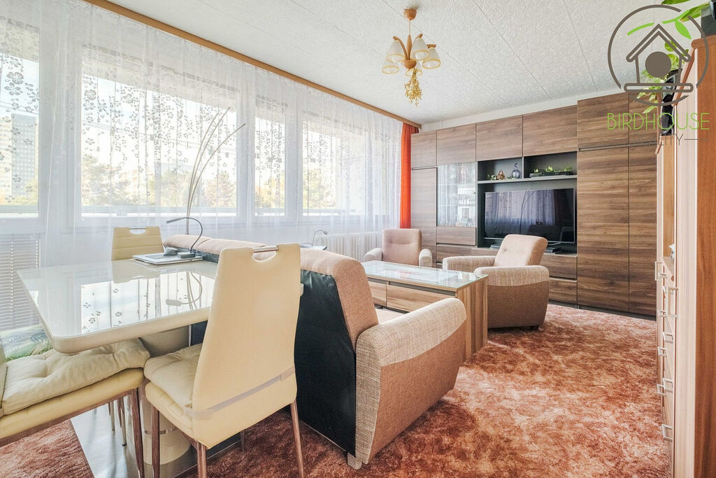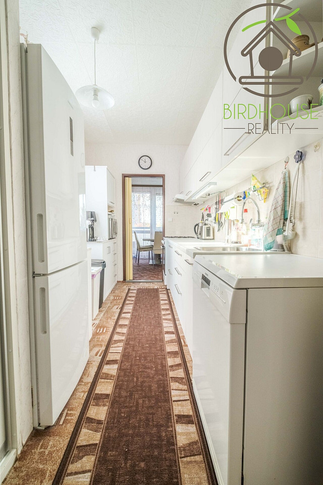 Obývací pokoj (21,1 m²) poskytuje dostatek prostoru pro sezení i jídelní kout a nabízí přímý vstup na prostornou lodžii (6,9 m²), která je ideální pro odpočinek. Kuchyně (8,54 m²) je vybavena kuchyňskou linkou ve velmi dobrém stavu. Dva samostatné pokoje (12,2 m² a 13,5 m²) lze využít jako ložnici a dětský pokoj, případně pracovnu. Všechny pokoje jsou vybavené praktickými předokenními roletami, které zajišťují soukromí.