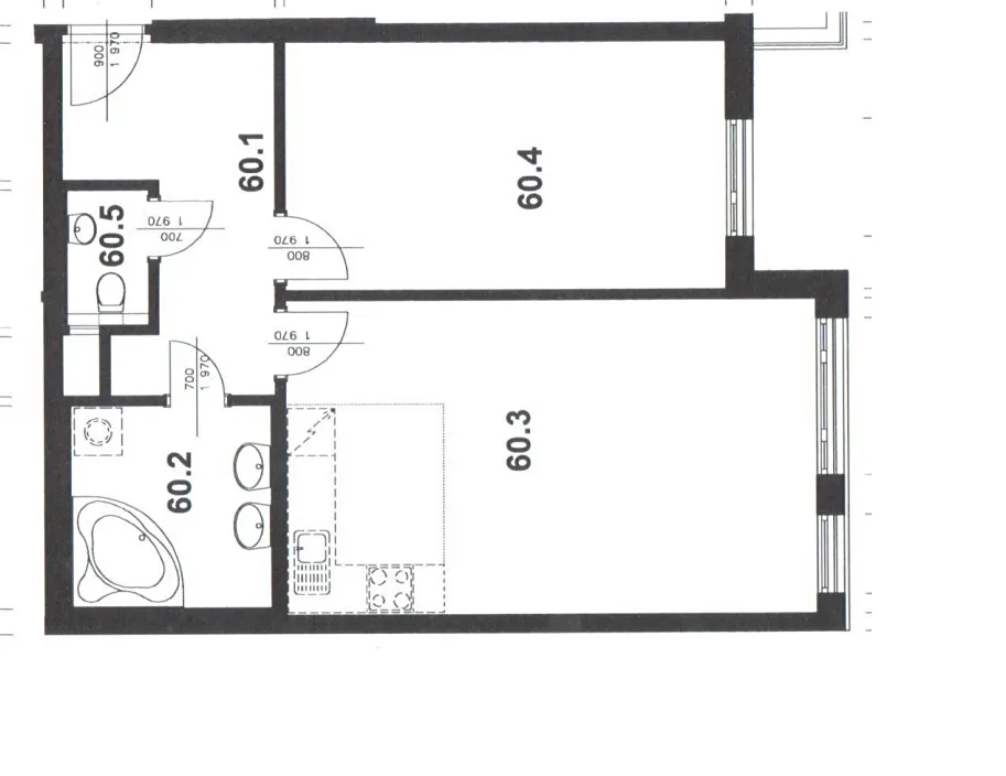 Byt sestává ze vstupní chodby s vestavěnou skříní, ložnice, obývacího pokoje s kuchyňským koutem, koupelny s vanou a samostatného WC.