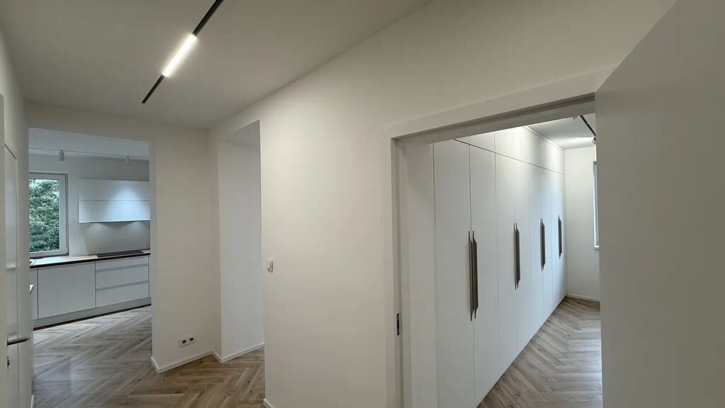 Byt prošel náročnou, kompletní a velmi citlivou rekonstrukcí na jaře tohoto roku. Majitel neponechal nic náhodě a s požadavkem na vytvoření moderního, vzdušného a příjemného bydlení. Tento záměr se mu ve spolupráci se šikovnou stavební firmou, stolaři, podlaháři, elektrikáři, instalatéry a specialisty na odhlučnění mimořádně povedl. Vše probíhalo pod dohledem architekta, který velmi citlivě, vkusně, jednoduše a přitom účelně volil jednotlivé barvy nábytku, vestavěných skříní a prvků, provedení , materiály a rozložení nové kuchyně, výběr moderních bezfalcových dveří s obložkami, vyrovnání podlah a položení velmi hezké laminátové podlahy v dřevěném dekoru v ducha místa a Baťovské éry. Stejně jako výběr velmi nestandartních páskových obkladů do koupelny a WC v industriálním stylu, výběr skříněk do koupelny, WC, botníku na chodbě nebo pouzdru na klíče, to vše v kontrastním dřevěném dekoru k čistým liniím bytu.