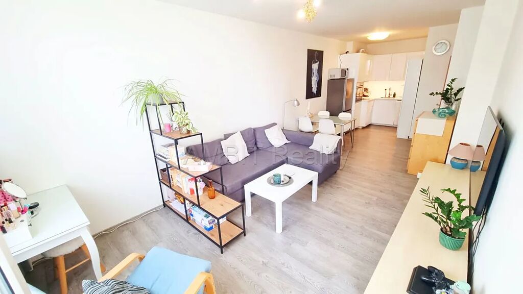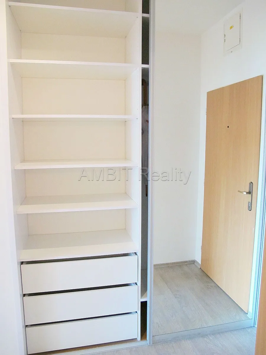 Tento moderní byt sestává z obývacího pokoje s kuchyňským koutem, ložnice, koupelny s WC, předsíně a balkónu. Byt se pronajímá zařízený - viz foto. Kuchyňský kout je vybavený novou moderní kuchyňskou linkou, elektrickým sporákem s indukční varnou deskou a elektrickou pečicí troubou, samostatně stojící lednicí s mrazákem, digestoří, mikrovlnnou troubou, potravinovou skříní a jídelním stolem se čtyřmi židlemi. V obývacím pokoji se nachází rozkládací rohová sedací souprava, konferenční stolek, křeslo, komoda, nízké úložné skříňky a televize (ostatní zařízení na foto je současného nájemce). Z obývacího pokoje lze vyjít na prostorný balkón. V ložnici je dvoulůžko s nočními stolky a vysoká vestavná šatní skříň se zrcadlovými dveřmi. Díky nim, stejně jako díky vysokým vestavěným skříním v předsíni, skýtá byt velké množství potřebných úložných prostor. V koupelně se nachází umyvadlo s podumyvadlovou skříňkou, vana, WC a automatická pračka s horním plněním.