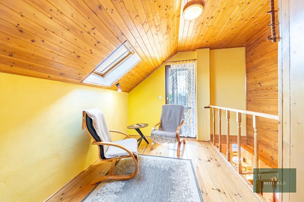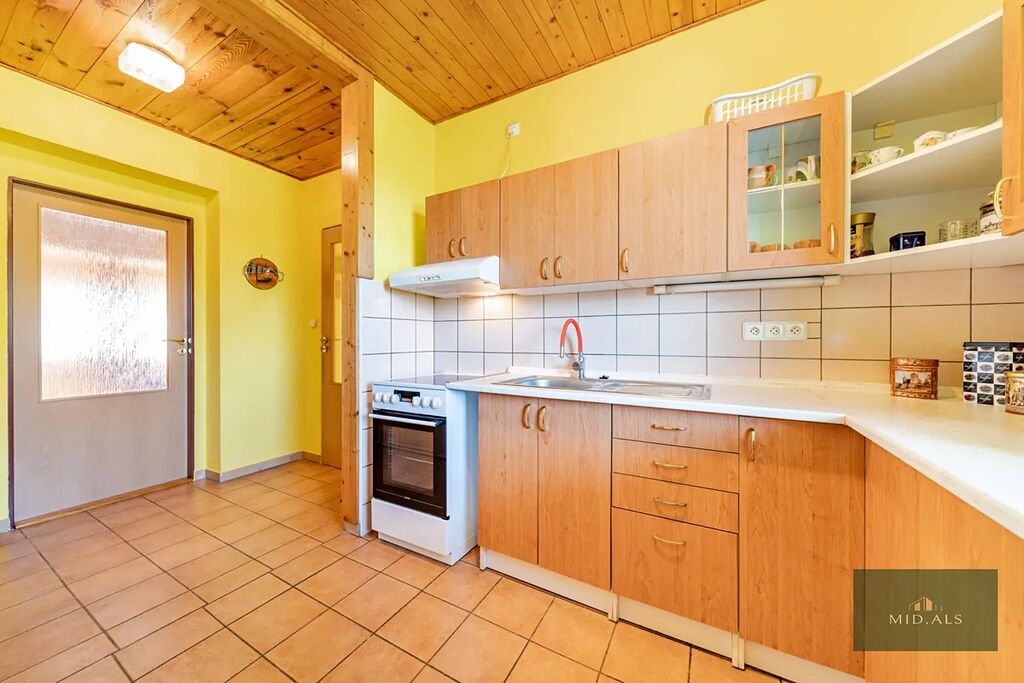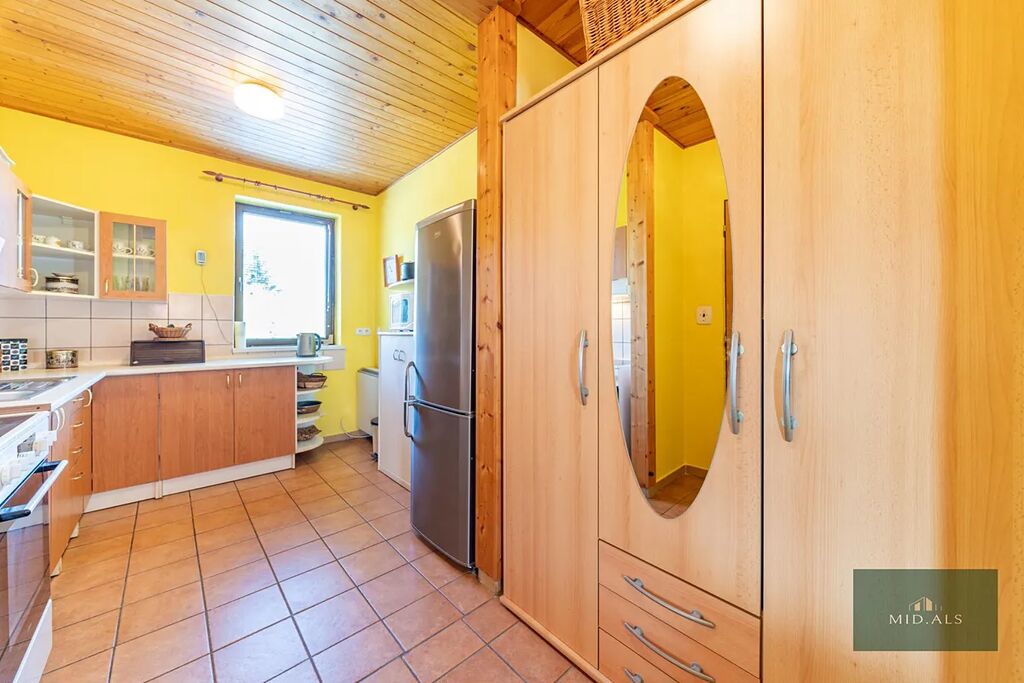 Stropy a části zdí jsou obloženy modřínovým dřevem, což nejen působí izolačně, ale hlavně celou nemovitost příjemně zateplí. Podlahy jsou pokryty dlažbou a dřevěnými prkny.