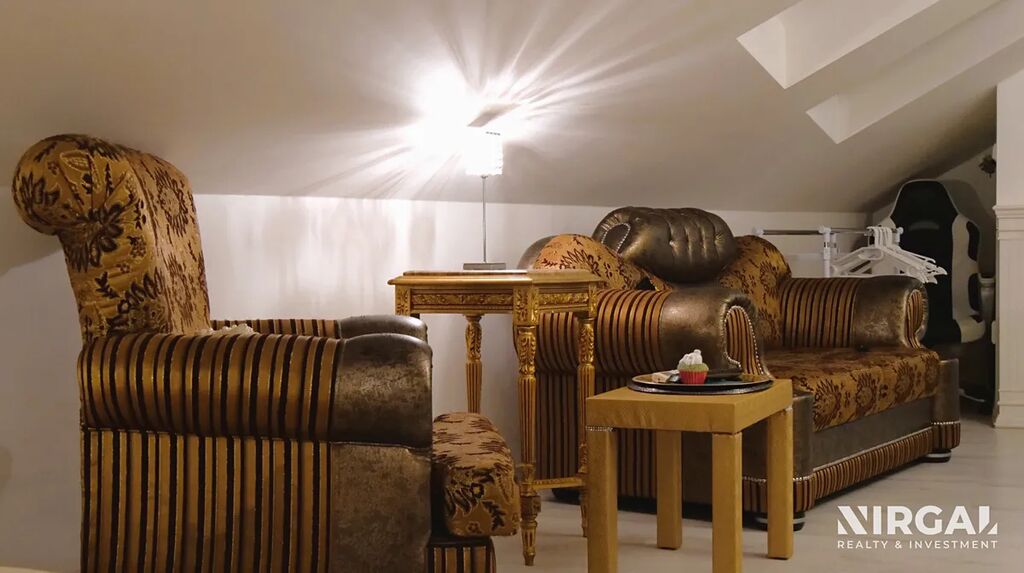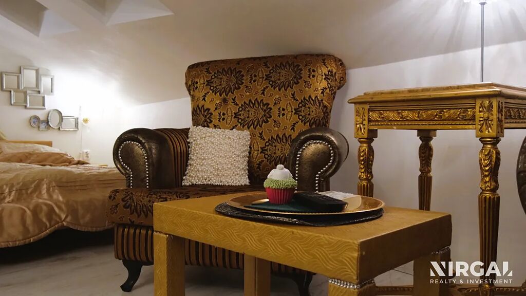 Dispozice je navržena pro pohodlné bydlení jednotlivce nebo páru. Interiér je laděn v estetice neoklasicismu s prvky francouzského šarmu: jemné osvětlení, akcenty v texturách, dekorativní krbový portál, kvalitní nábytek a charakteristické linie podkroví dodávají prostoru osobitý styl.