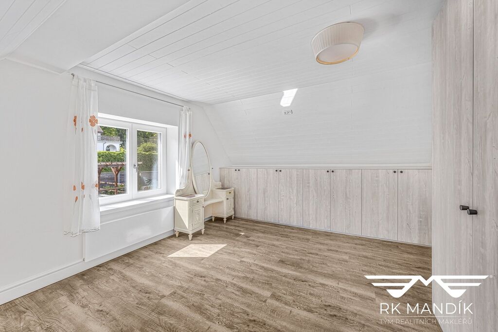 V patře se nachází dvě komfortní ložnice s vestavěnými skříněmi, dále praktický prostor ideální pro pracovnu či domácí kancelář, a samostatná toaleta s umyvadlem.