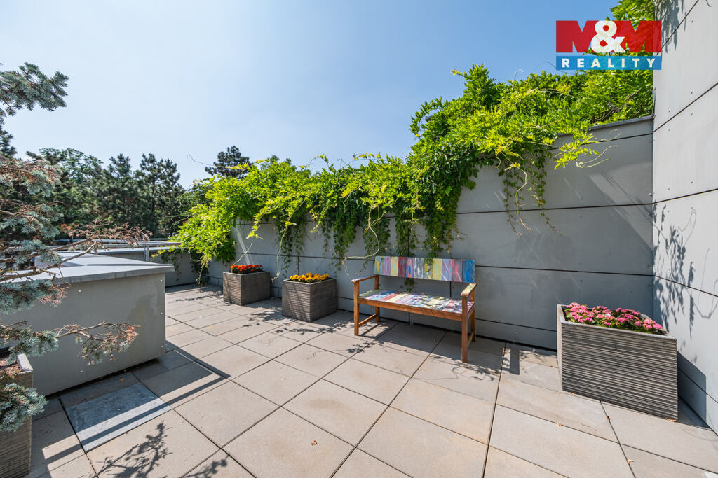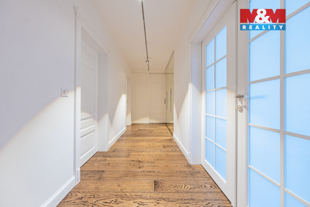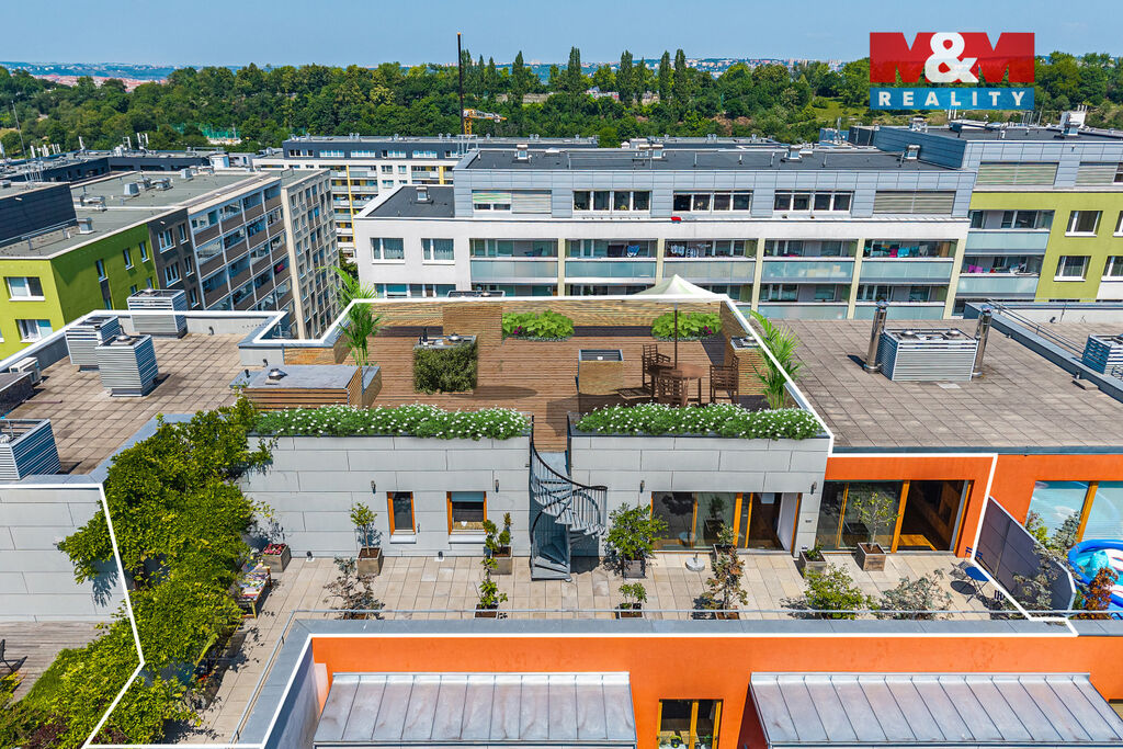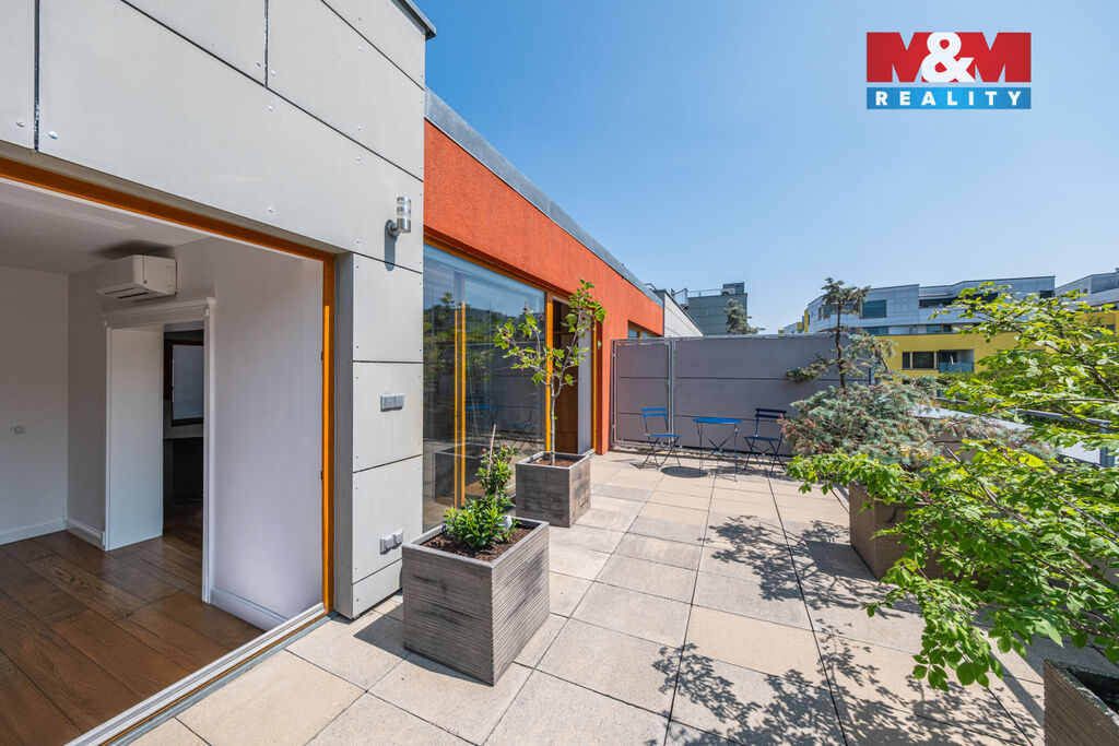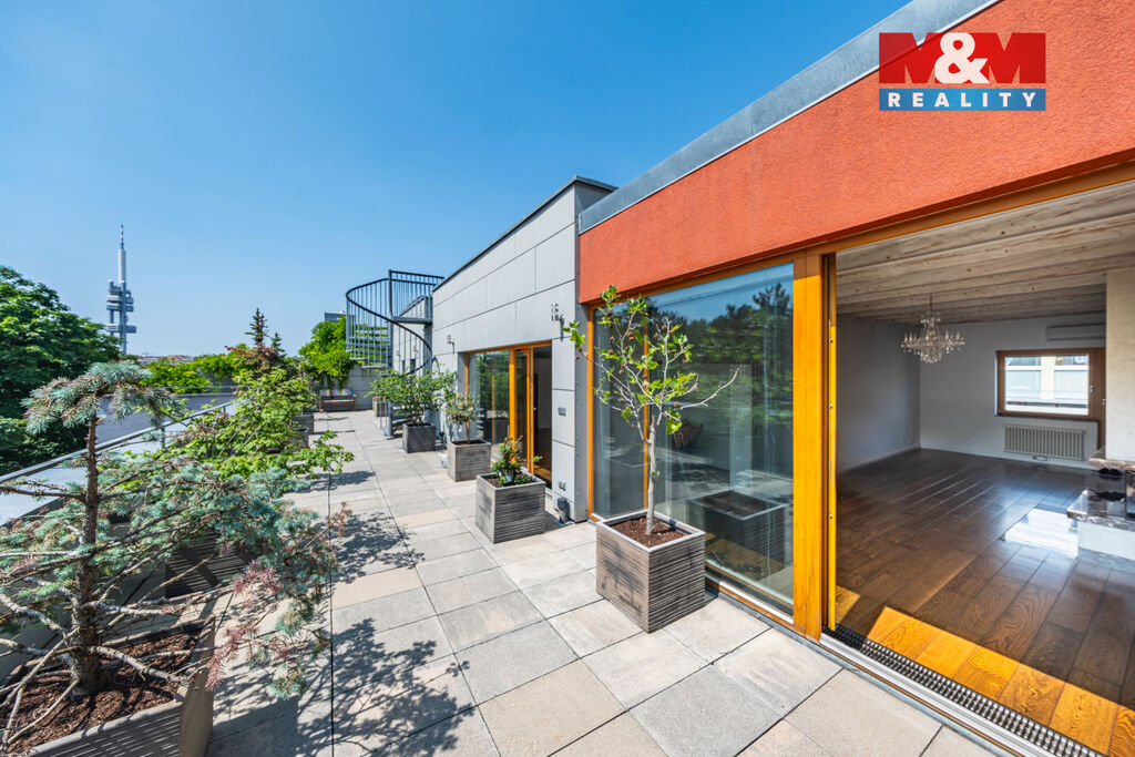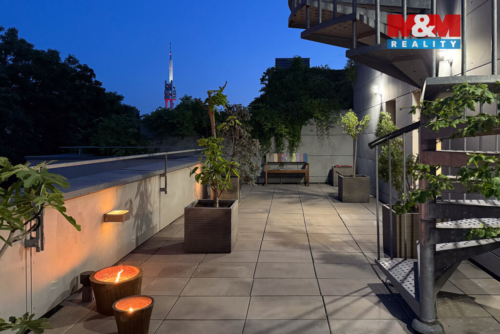 V prestižní lokalitě v samém srdci Prahy nabízíme unikátní byt o dispozici 5+kk o podlahové ploše 175,8 m² se dvěma slunnými terasami v 6. NP 63,9 m² a v 7. NP 132,1 m² s dechberoucím výhledem na Prahu, severní balkón 8 m² a navíc  prostorný sklep o velikosti 13,2 m². Interiér nabízí prostornou vstupní chodbu s vestavěnými skříněmi a samostatnou šatnou, tři ložnice, dvě koupelny s kamennou podlahou s podlahovým vytápěním, značkovým sociálním zařízením Villeroy&Boch s hudebním systémem. Dominantou bytu je velkorysý obývací pokoj se zvýšeným stropem, kroy a krbem, prostorná jídelní místnost, kuchyňský kout s podlahovým vytápěním, s vestavěnými spotřebiči luxusní zn. SMEG, americkou chladničkou a vinotékou. Dalšími nadstandardními prvky jsou dubové odhlučněné podlahy, knihovna s LED osvětlením, klimatizace Toshiba v každém pokoji, odhlučněné stěny. Možné přikoupit garážové stání + 1mil. Kč. Byt nabízí naprosté soukromí, špičkový komfort a výjimečný výhled na celou Prahu.