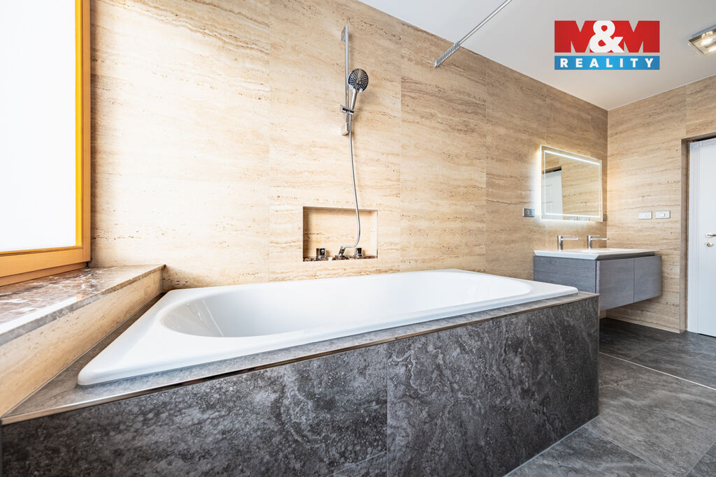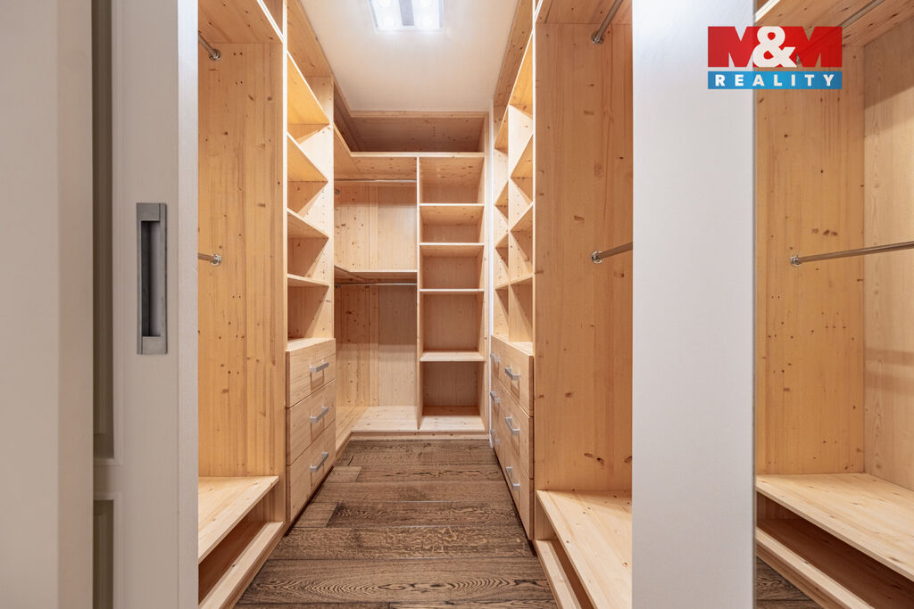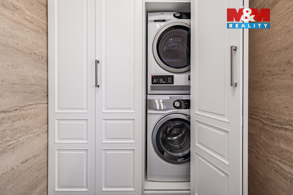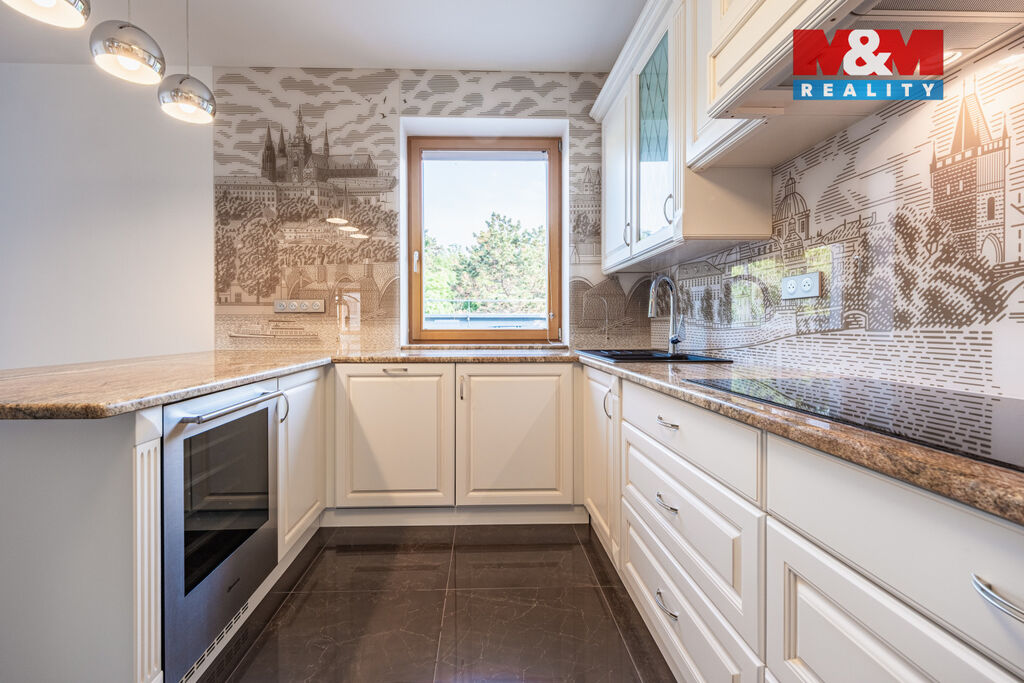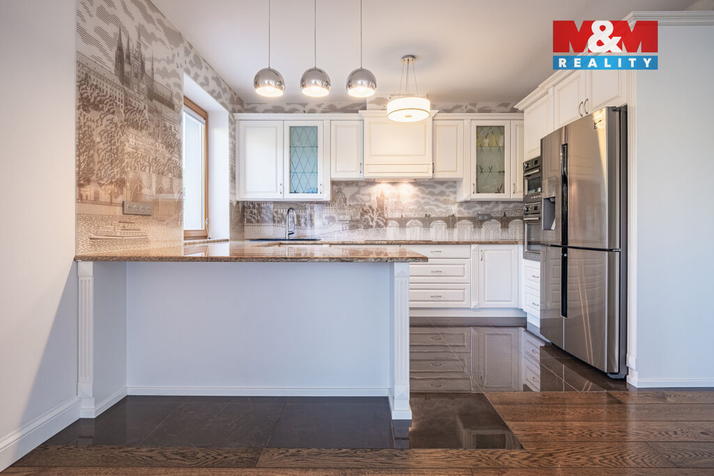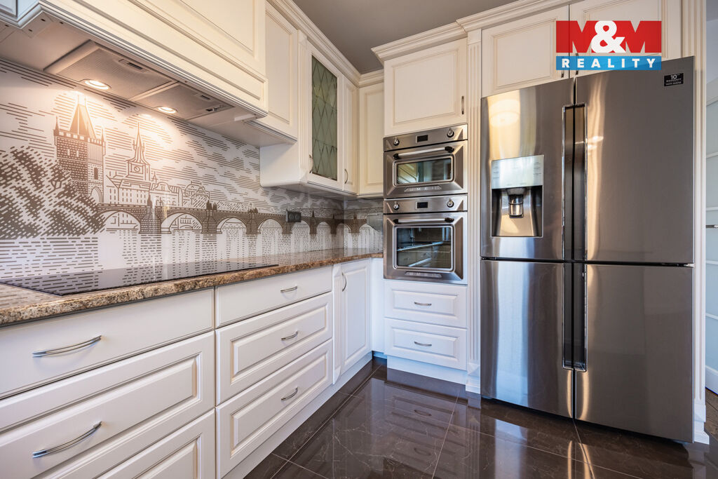 V prestižní lokalitě v samém srdci Prahy nabízíme unikátní byt o dispozici 5+kk o podlahové ploše 175,8 m² se dvěma slunnými terasami v 6. NP 63,9 m² a v 7. NP 132,1 m² s dechberoucím výhledem na Prahu, severní balkón 8 m² a navíc  prostorný sklep o velikosti 13,2 m². Interiér nabízí prostornou vstupní chodbu s vestavěnými skříněmi a samostatnou šatnou, tři ložnice, dvě koupelny s kamennou podlahou s podlahovým vytápěním, značkovým sociálním zařízením Villeroy&Boch s hudebním systémem. Dominantou bytu je velkorysý obývací pokoj se zvýšeným stropem, kroy a krbem, prostorná jídelní místnost, kuchyňský kout s podlahovým vytápěním, s vestavěnými spotřebiči luxusní zn. SMEG, americkou chladničkou a vinotékou. Dalšími nadstandardními prvky jsou dubové odhlučněné podlahy, knihovna s LED osvětlením, klimatizace Toshiba v každém pokoji, odhlučněné stěny. Možné přikoupit garážové stání + 1mil. Kč. Byt nabízí naprosté soukromí, špičkový komfort a výjimečný výhled na celou Prahu.