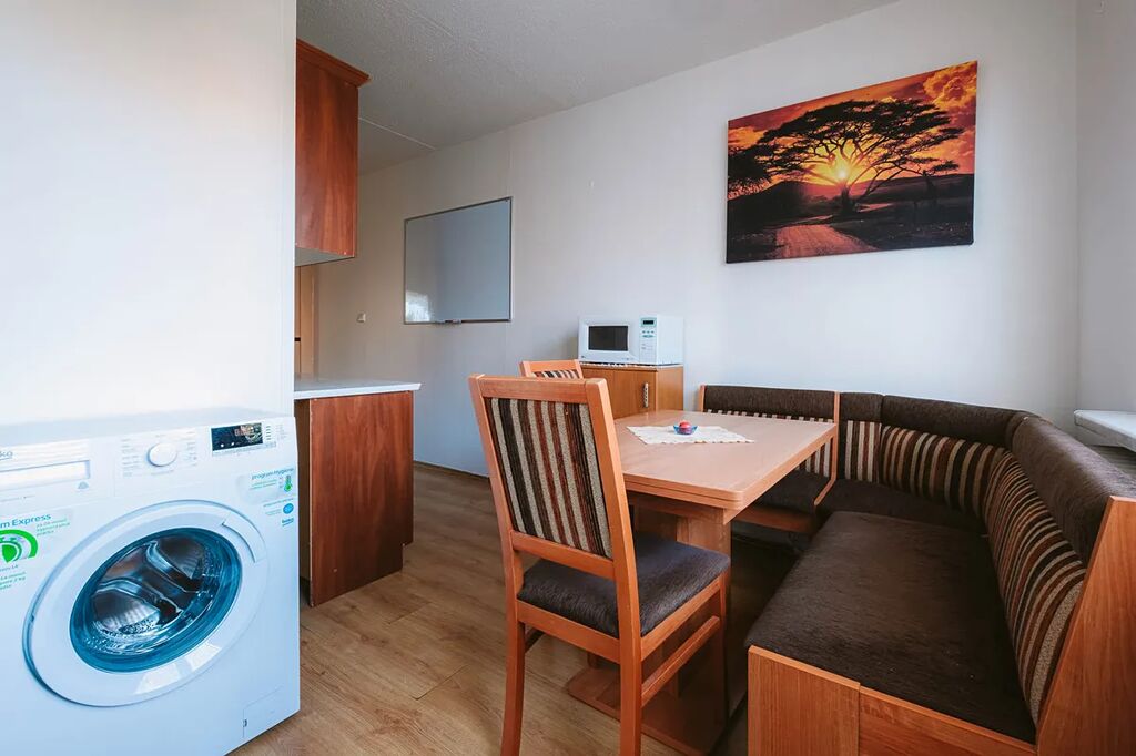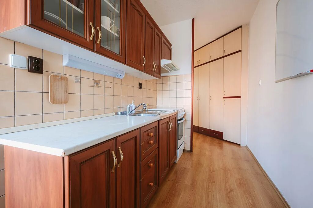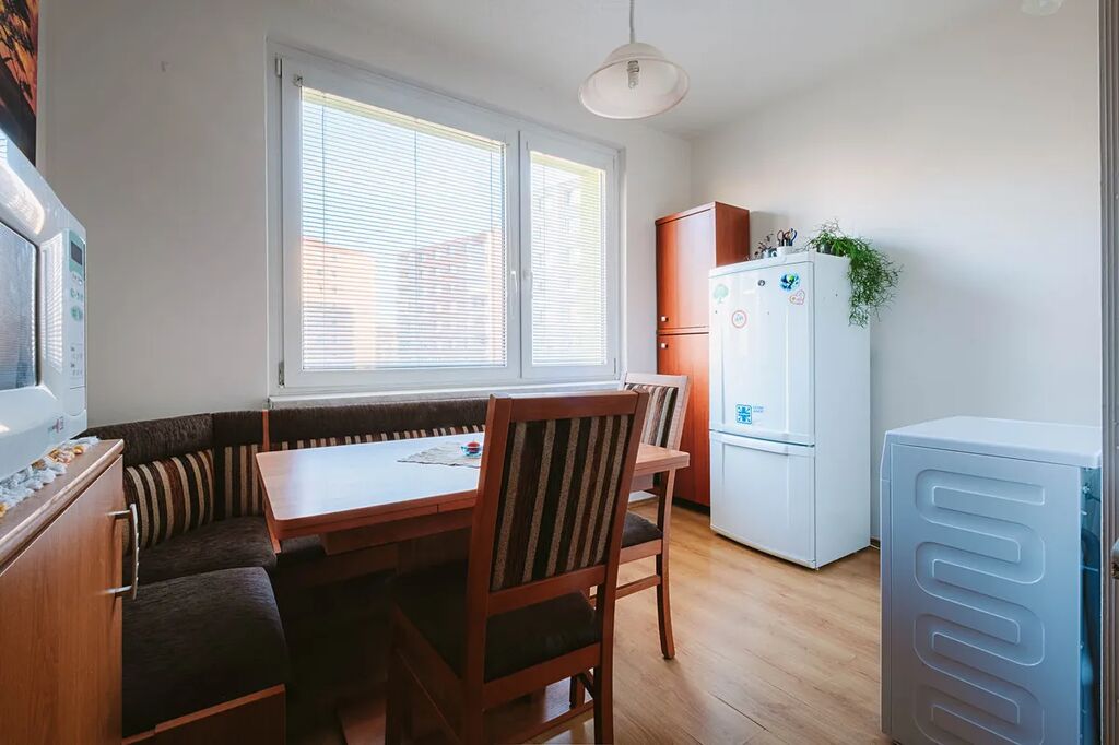 Byt disponuje velmi prostornou vstupní chodbou s vestavěnou skříní, samostatným WC, koupelnou s vanou, kuchyní s kuchyňským koutem a obývacím pokojem. Byt má plastová okna (dvojskla), plovoucí podlahy, jádro původní. Byt má také balkón (4 m2) s nádherným výhledem do přírody. K bytu náleží dvě sklepní kóje. Celý dům prošel revitalizací, je zateplený a v roce 2026 je plánovaná realizace výtahu. Vytápění bytu je dálkové ústřední, stejně jako ohřev vody (TTS). Celkové měsíční náklady na bydlení jsou 4 500 Kč (voda, ohřev vody, el., plyn, fond oprav, úklid společných prostor, internet).