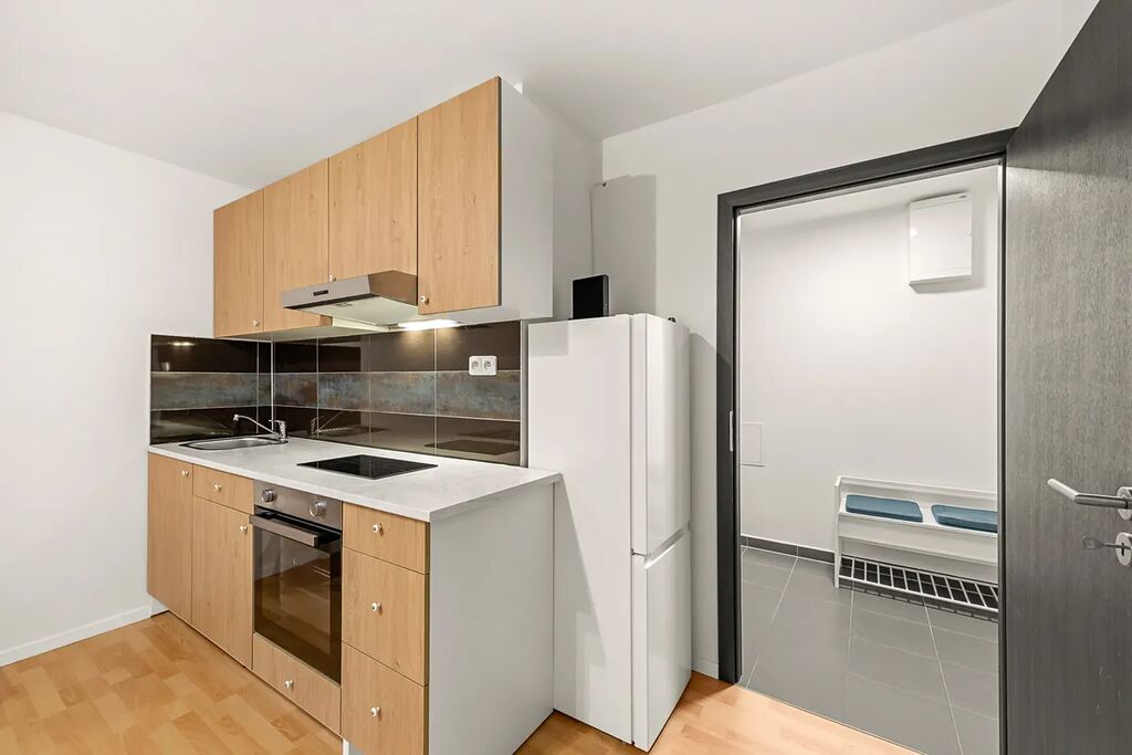 Součástí vybavení je kuchyňská linka včetně spotřebičů, pračka a dostatek úložných prostor.