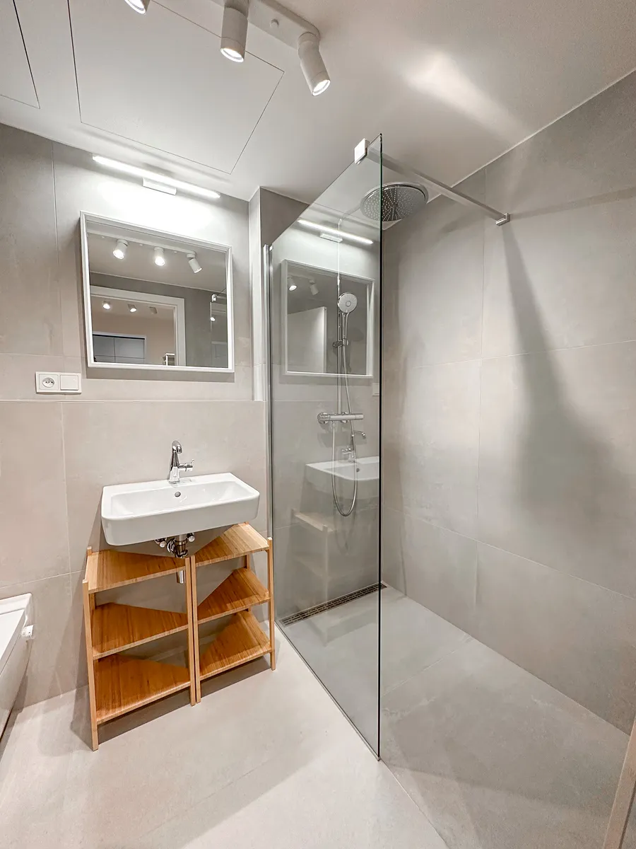 V bytě jsou vestavěné skříně, koupelna s toaletou, pračka se sušičkou, manželská postel s úložným prostorem, rozkládací gauč, TV, kuchyňská linka (lednice, trouba, myčka, indukční deska, digestoř). Byt má dřevěná francouzská okna. Je zde podlahové vytápění, rekuperace, klimatizace a venkovní žaluzie. Dětský pokoj či pracovna zůstává nevybavený, abyste si pokoj přizpůsobili dle vlastních představ.