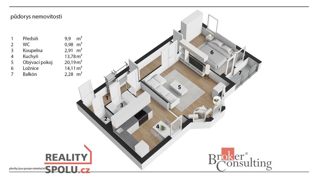 Bytová jednotka se skládá z prosvětleného obývacího pokoje, samostatné kuchyně, ložnice se vstupem na lodžii, dlouhé předsíně s úložnými prostory, koupelny a samostatného WC.