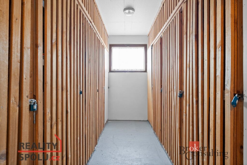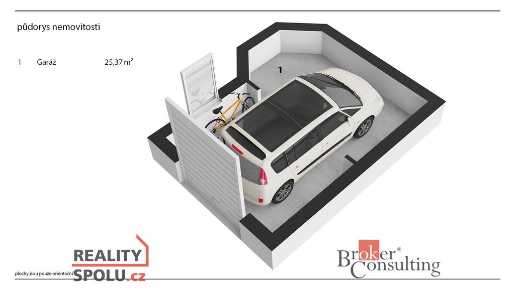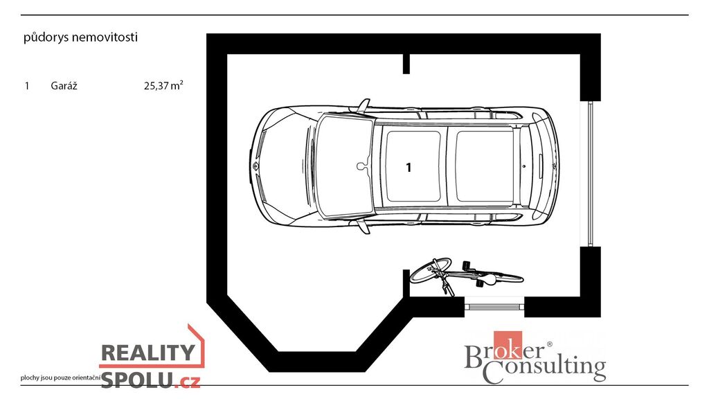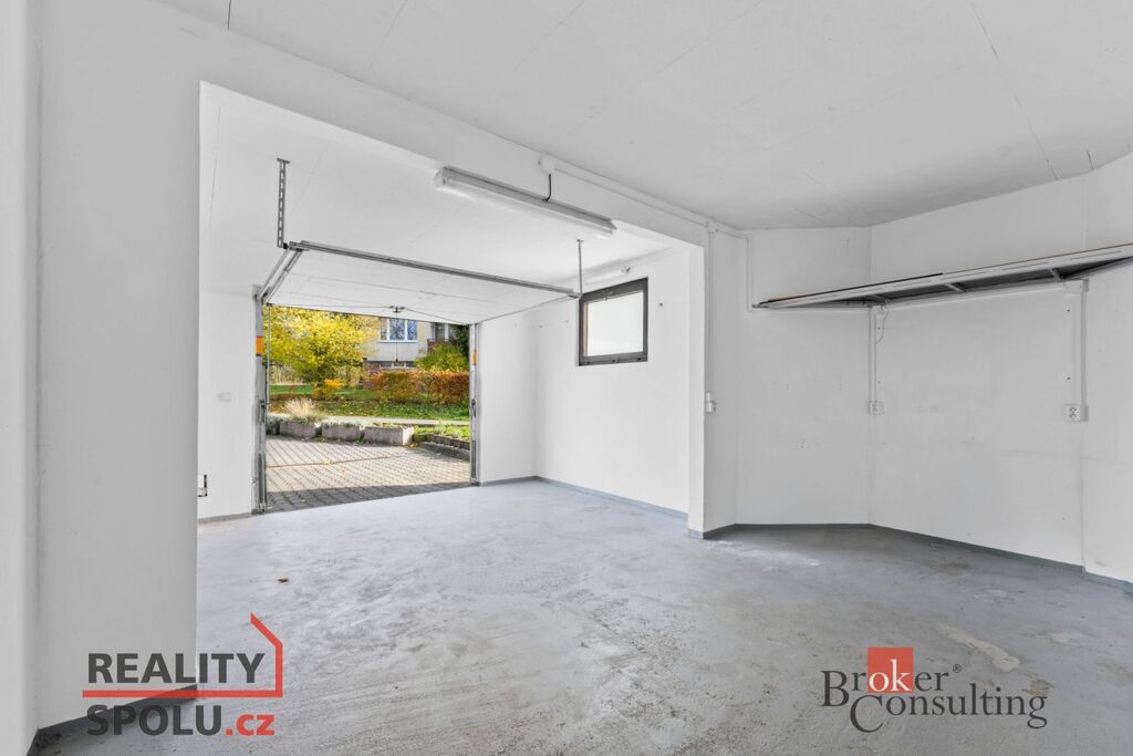 Prostorná garáž (25,37m2) je přímo v domě. Má samostatná vrata a dostatek úložného prostoru i po zaparkování vozu.