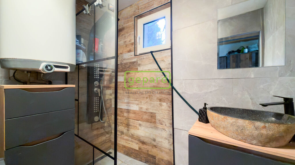 Přízemí – vstup do domu přes přistavěné zádveří, následuje chodba se schodištěm na půdu, technická místnost s kotlem, kuchyně, obývací pokoj, posilovna, 2 ložnice, koupelna se sprchovým koutem, umyvadlem a bojlerem a samostatné WC.