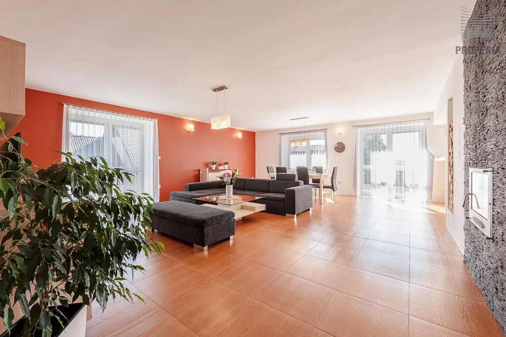 • obývací pokoj s krbem propojený s moderní kuchyní a jídelnou, odkud vedou dveře přímo na terasu