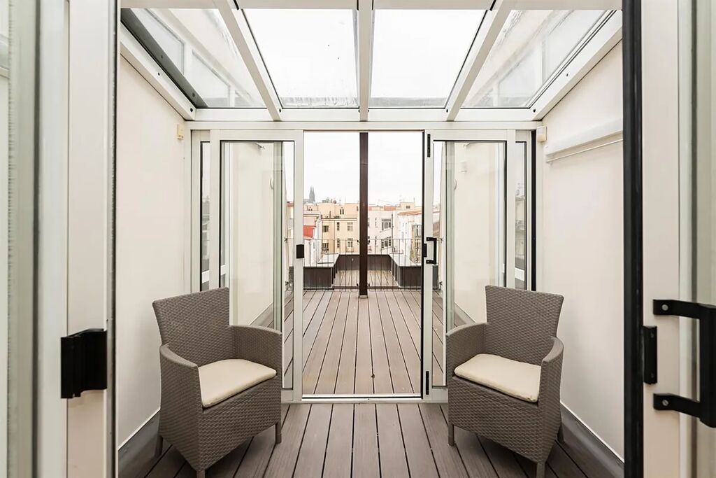 Luxusní prostorný mezonet s terasou a zimní zahradou, 5+kk (4 ložnice, 3 koupelny) o celkové rozloze 248 m2 je situovaný v 6. a 7. patře rezidenčního domu s výtahem. Byt nabízí obývací pokoj s plně vybavenou kuchyní (sporák/trouba, lednice, myčka) oddělenou skleněnou příčkou, 4 ložnice situované do klidné zóny vnitrobloku, 3 koupelny (sprcha, vana, bidet), 2x šatnu, komoru a prádelnu. Byt je vybaven nábytkem. Terasa a zimní zahrada jsou situované na jižní stranu. Nádherný výhled na Hradčany. SAT, telefonní linka a internet.