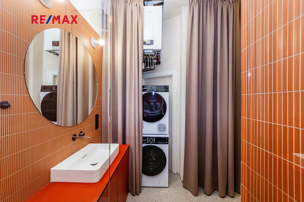Součástí bytu je také moderní koupelna s toaletou a prostorem na pračku. Díky vysokým stropům vznikly navíc dva útulné výklenky, které aktuálně slouží jako pracovní kout a relaxační zóna – ideální pro čtení, odpočinek či práci z domova.