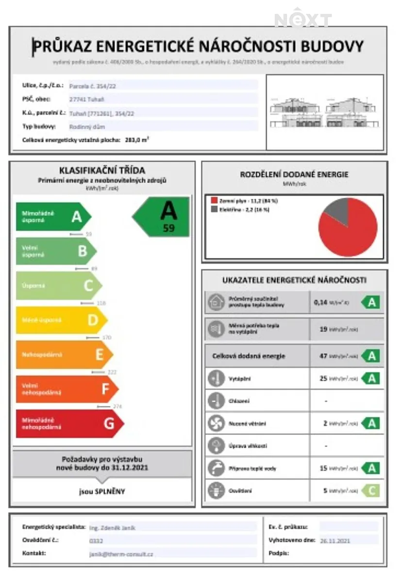 Exklusivně Vám nabízíme prodej pasivního rodinného domu č. 6. o dispozici 5+KK s užitnou plochou 131,9 m a pozemkem 428 m2, který se dá rozšířit o dalších 600m2 v jedinečné lokalitě, která Vás doslova uchvátí. Jedná se o Rezidenční projekt v obci Červená Píska. Pokud se přijedete přesvědčit osobně na lokalitu, jistě pochopíte, proč tento projekt nese právě Jméno Oáza. Jde o velice atypický řešené nízkoenergetické dvojdomy, ve vysokých standardech, kde se klade důraz především na soukromí obou polovin domu. Dispozice domu: Přes zádveří je možné projít do menší otevřené šatny a odtud rovnou do obývacího pokoje s kuchyňským koutem. To může být velká výhoda pro ty z Vás, kteří pracujete z domu a nechcete si klienty, případně návštěvy vodit skrze celý dům. Z prostorného obýváku vede chodba, ze které jsou přístupné všechny ostatní místnosti v domě. Tedy pracovna, technická místnost, dva dětské pokoje, ložnice s vlastní šatnou a v neposlední řadě koupelna s vanou i sprchovým koutem a WC. Navíc je zde i samostatné WC s umyvadlem. U obývacího pokoje a ložnice je přímý vstup na terasu. Výhodou tohoto domu je, že má absolutní soukromí s výhledem do zeleně a v podstatě bez sousedů. Kolaudace 3 dvojdomů proběhla již v srpnu 2023, tento poslední byl zkolaudován letos v létě. Pokud si přejete bydlet v rezidenčním komplexu s přístupem k jezeru a dobrou dostupností nedaleko Prahy, pak je tento projekt třeba právě pro Vás. Z vedlejší obce Tišice jezdí vlak na Hlavní nádraží, po modernizaci tratě bude dojezd do 30 minut. Okresní město Mělník se nachází 7 kilometrů na severozápad, ráno je dosažitelné školním autobusem do 15 minut. Moderní mateřská škola je v obci Tuhaň, ZŠ je 2 km směrem k Mělníku ve vedlejší obci v Záboří. Populární jezero Konětopy a Lhota jsou vzdáleny 10 minut autem. Lokalita na západní straně přiléhá k obci, byť vzdálenost k nejbližšímu domu je více jak 200 metrů, na severní a východní straně se rozkládá volná krajina, na jižní straně přes silnici se nachází rozsáhlý lužní les. Volná krajina vybízí k dlouhým vycházkám, k projížďkám na horském kole či vyjížďkám na koni. V tomto speciálním místě, který je součástí budoucí rezidence na Červených Pískách, bych chtěl vyzdvihnout perfektní fungování a správu Obce Tuhaň, která po celý rok pořádá spoustu akcí pro všechny věkové kategorie. Obec Červená Píska spadá právě pod obec Tuhaň, odkud je možné se dostat do Letňan je 20-25 minut, na Černý most se dostanete přes Starou Boleslav a dálnici D10 za 30 minut. Domy jsou již napojeny na všechny inženýrské sítě - vodovod, elektřina, plyn a optický internet. Jedná se o poslední volnou bytovou jednotku v tomto projektu. Pro více informací kontaktujte makléře Pro komunikaci uvádějte evidenční číslo zakázky N103978.
