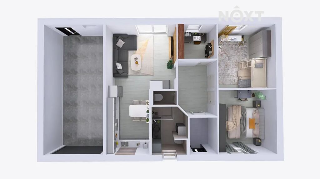 Pokud by do budoucna nestačila velikost domu 3+kk, lze přepažením velké garáže a propojením s obytným prostorem získat další pokoj orientovaný na jih do zahrady. Jeho výhodou je pak přímý vstup dveřmi na zahradu.