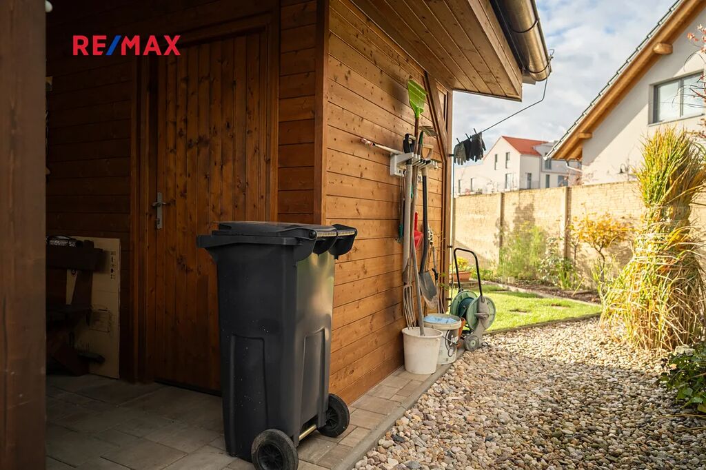 Dešťová voda je chytře využívána díky retenční nádrži s čerpadlem, kterou lze používat pro závlahu zahrady. Dům je tak nejen komfortní, ale i ekonomický a šetrný k životnímu prostředí.