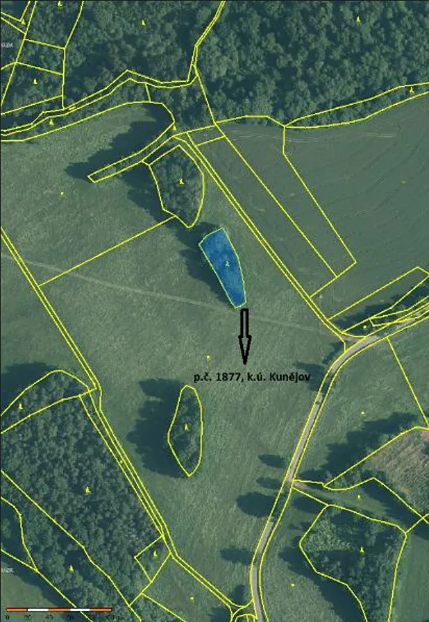Jedná se malý samostatný pozemek malé výměry (kázek), nacházející se uprostřed trvalého travního porostu ve vlastnictví fyzické osoby.