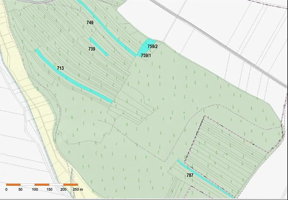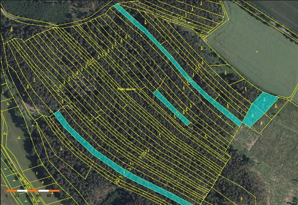 Jedná se o prodej lesních pozemků menší výměry, většinou úzkého protáhlého tvaru, rozptýlených po komplexu lesů v k.ú. Dolní Vilémovice. Na pozemcích se nachází mýtní porost BO, porost na pozemku parc. č. 787 byl vytěžen.