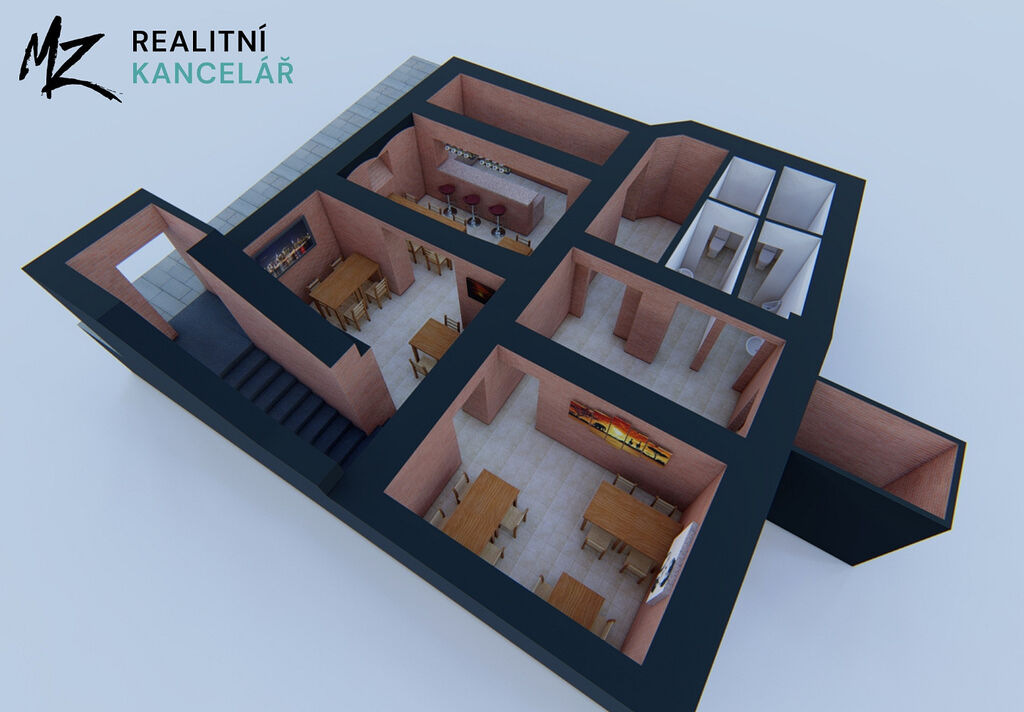 • Dispozice: 4 místnosti + bar + zázemí + sklad