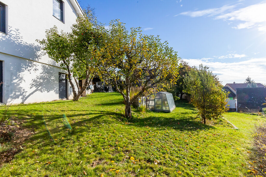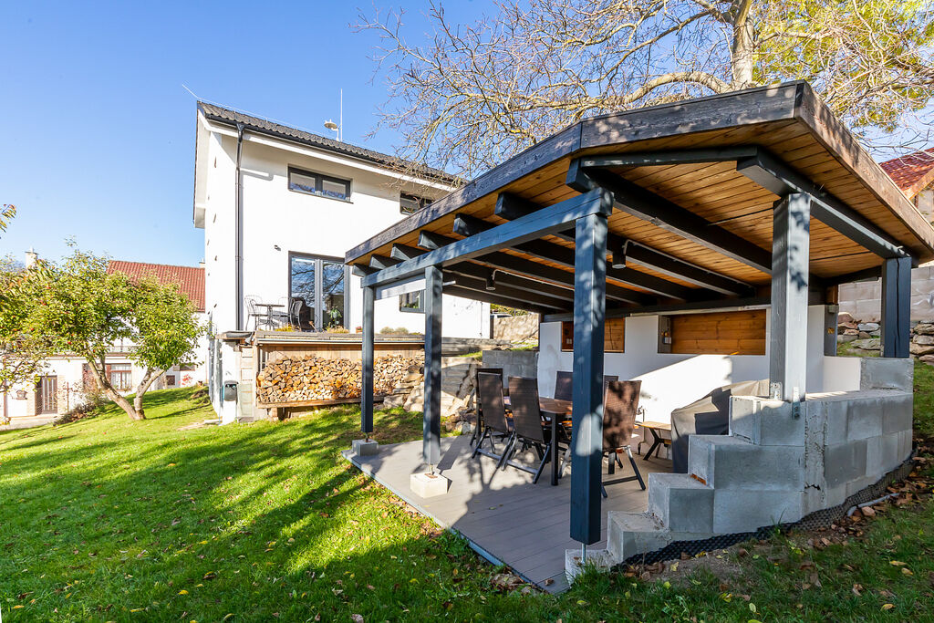 • Zahrada o rozloze 820 m² se skleníkem, pergolou s místem pro gril a přípravou na venkovní kuchyň.
