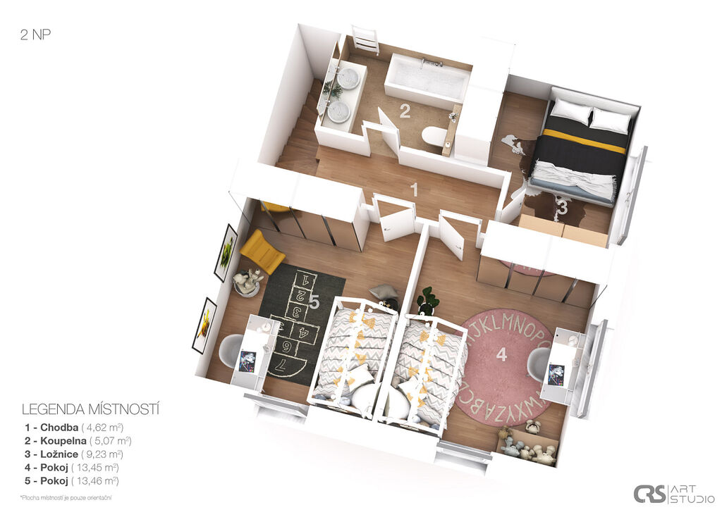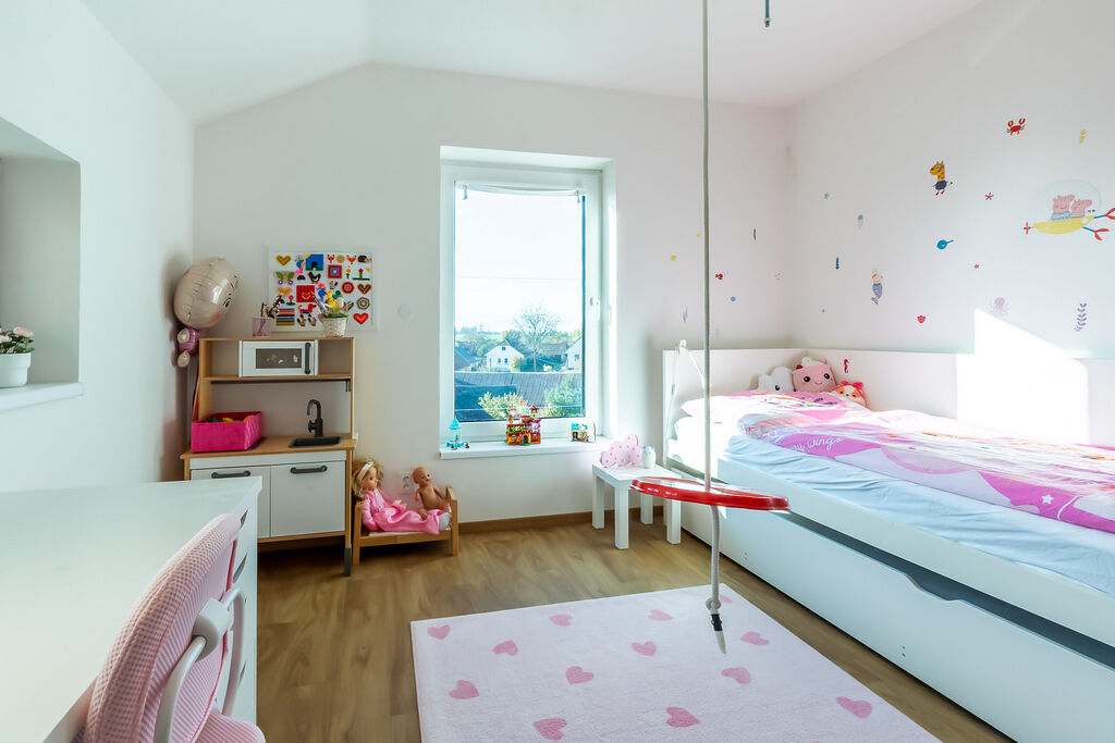 • Patro: hlavní ložnice, dva dětské pokoje a koupelna s WC.