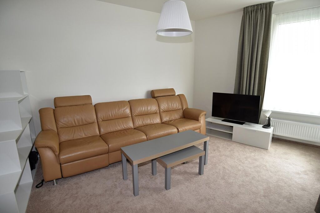 Velkou výhodou je samostatná šatna, která poskytuje dostatek úložných prostor, a moderní koupelna s vanou a pračkou. Interiér je laděn do moderního a nadčasového stylu, který podtrhují kvalitní materiály, koberce na podlahách a promyšlené designové detaily, díky nimž působí byt mimořádně útulně a harmonicky.