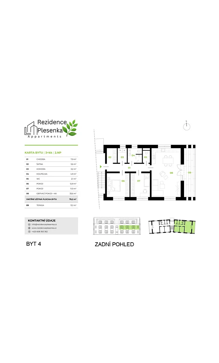 Byt č. 4 o velikosti 3+kk 80 m2 + TERASA 13m2 se nachází v novém bytovém projektu Rezidence Plesenka poblíž bytového domu Kaskády a zástavby rodinných domů v Ostravě Martinově.
