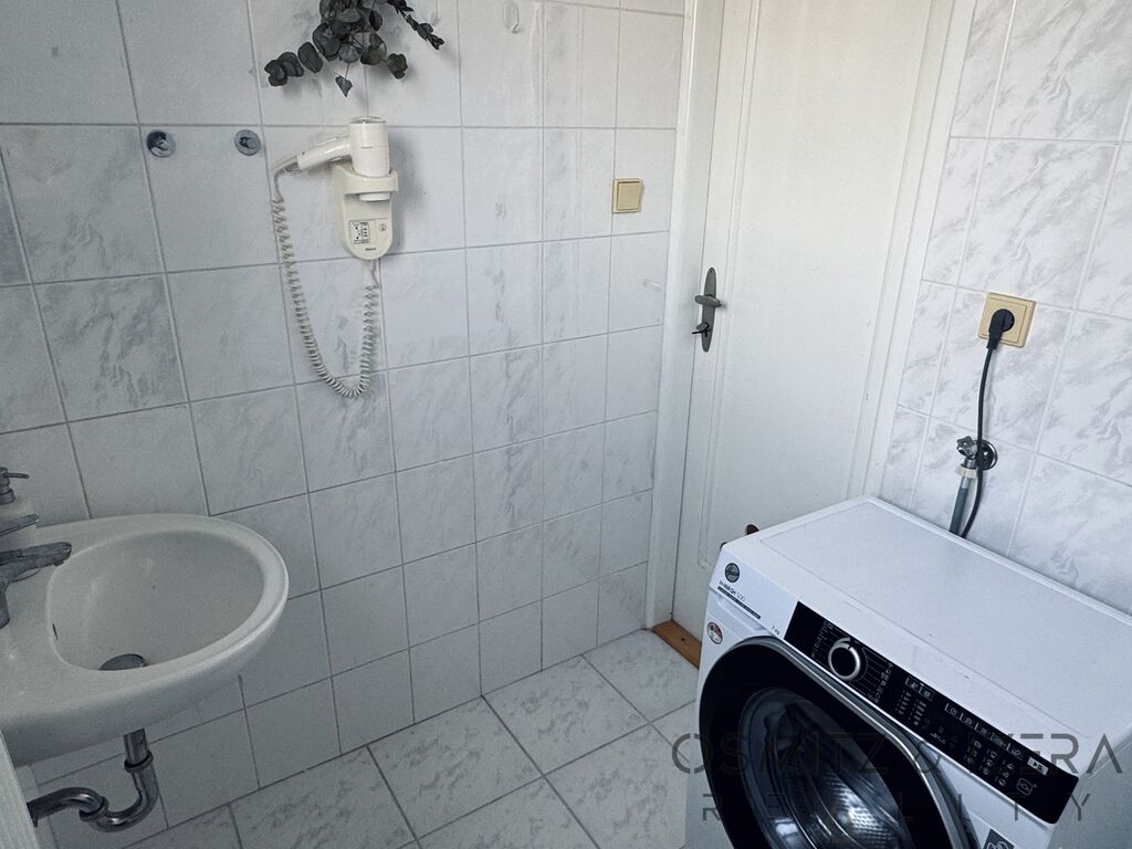 Byt je kompletně a vkusně vybaven. Podlaha je v obývacím pokoji parketová, ostatní podlahy jsou plovoucí. Hezká bílá kuchyňská linka je vybavena spotřebiči. V koupelně je k dispozici pračka.