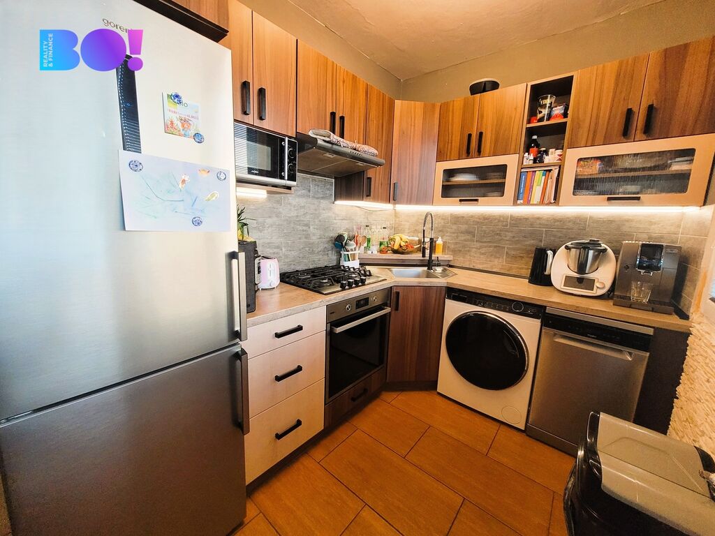 Dispozice bytu je velmi příjemná a praktická – dva pokoje jsou orientovány na východ, kde vás ráno probudí slunce, zatímco kuchyně a třetí pokoj směřují na západ a nabízejí klidné večerní světlo. Všude najdete odolnou plovoucí podlahu, na chodbě, v kuchyni, koupelně i na WC pak moderní dlažbu. Součástí je také kuchyňská linka se spotřebiči (trouba, digestoř, myčka), které jsou jen dva roky staré a energeticky úsporné.