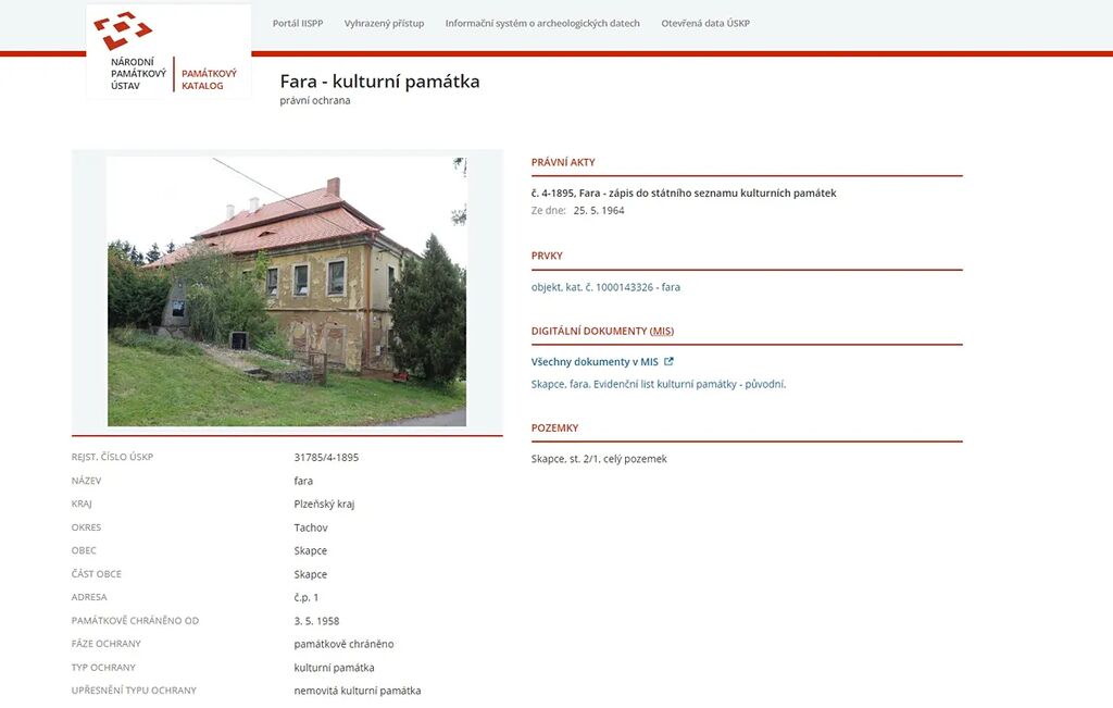 Prodej historického objektu v malebné obci Skapce, nacházející se 5 km od Kladrubského kláštera. K nemovitosti náleží též pozemek o velikosti 10 314 m2. Zastavěná plocha činí 465 m2. Nemovitost má působivou historii, stavbu zadal opat Kladrubského kláštera kolem roku 1720 známému architektu Janu Blažejovi Santini-Aichelovi, který zde postavil letní rezidenci mnichů z nedalekého slavného kláštera. Typická Santiniho práce – hra světla a stínů – je vidět nejvíce na stropech v interiérech.