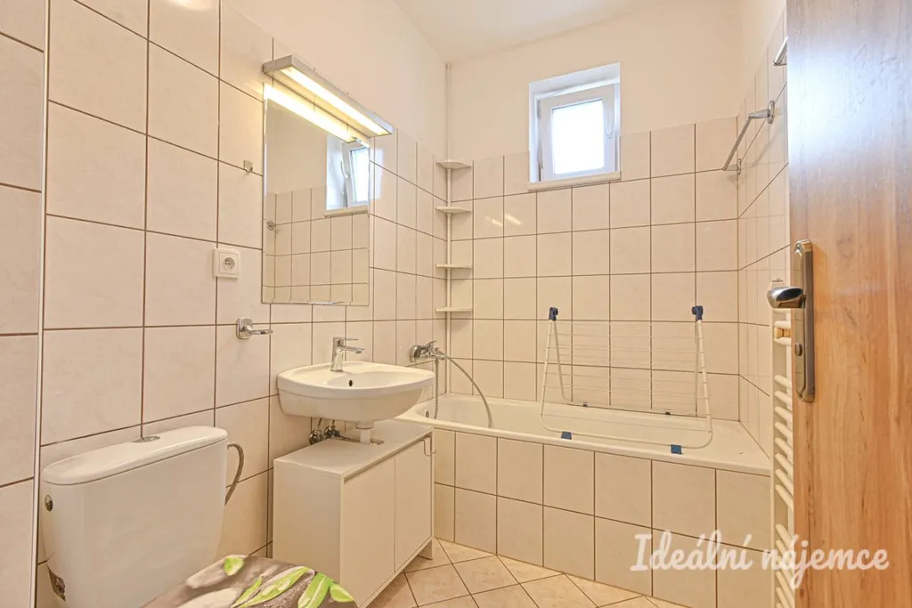 Byt se nabízí téměř bez vybavení. Koupelna disponuje vanou, umyvadlem se skříňkou, pračkou a toaletou.
